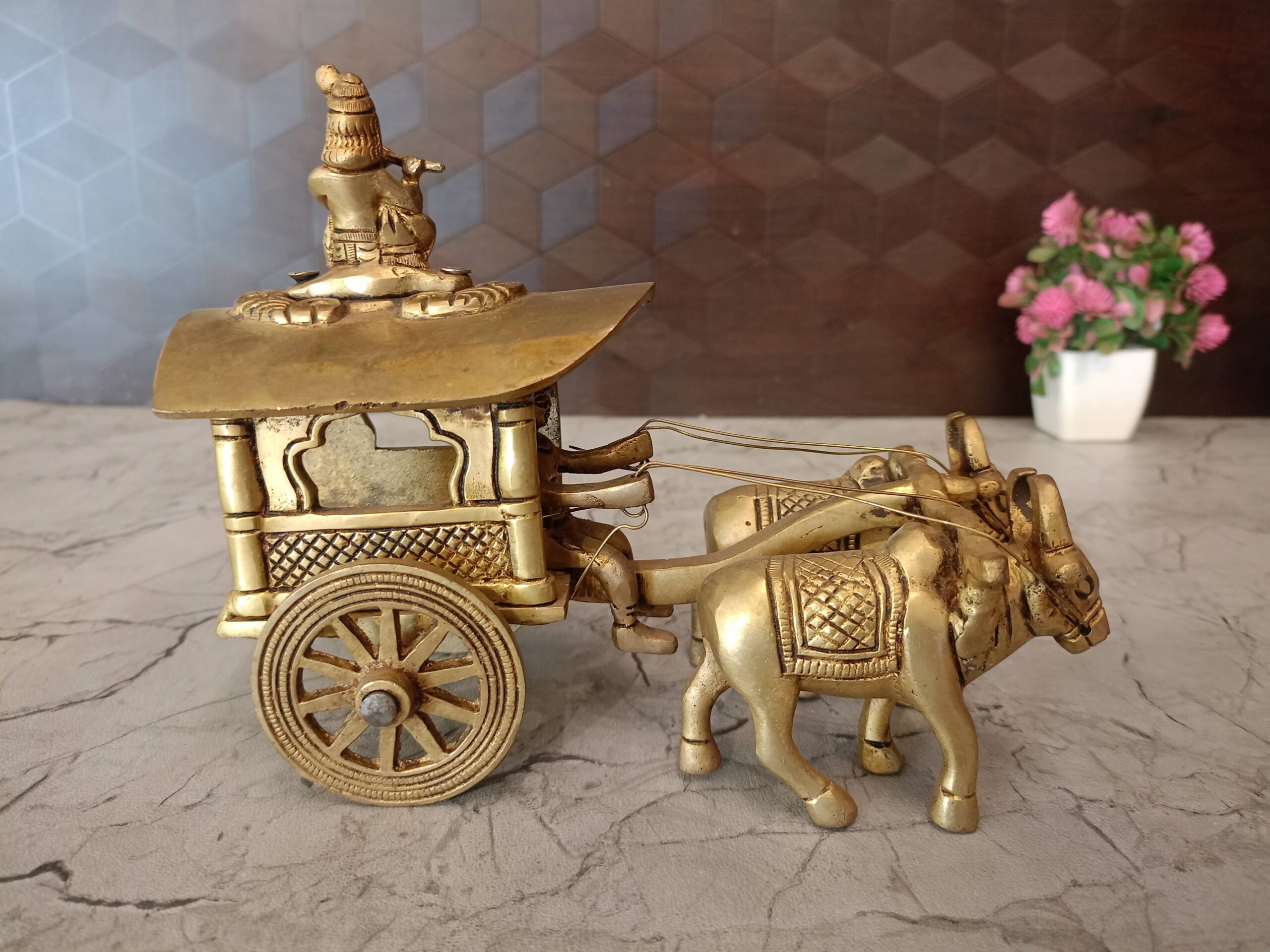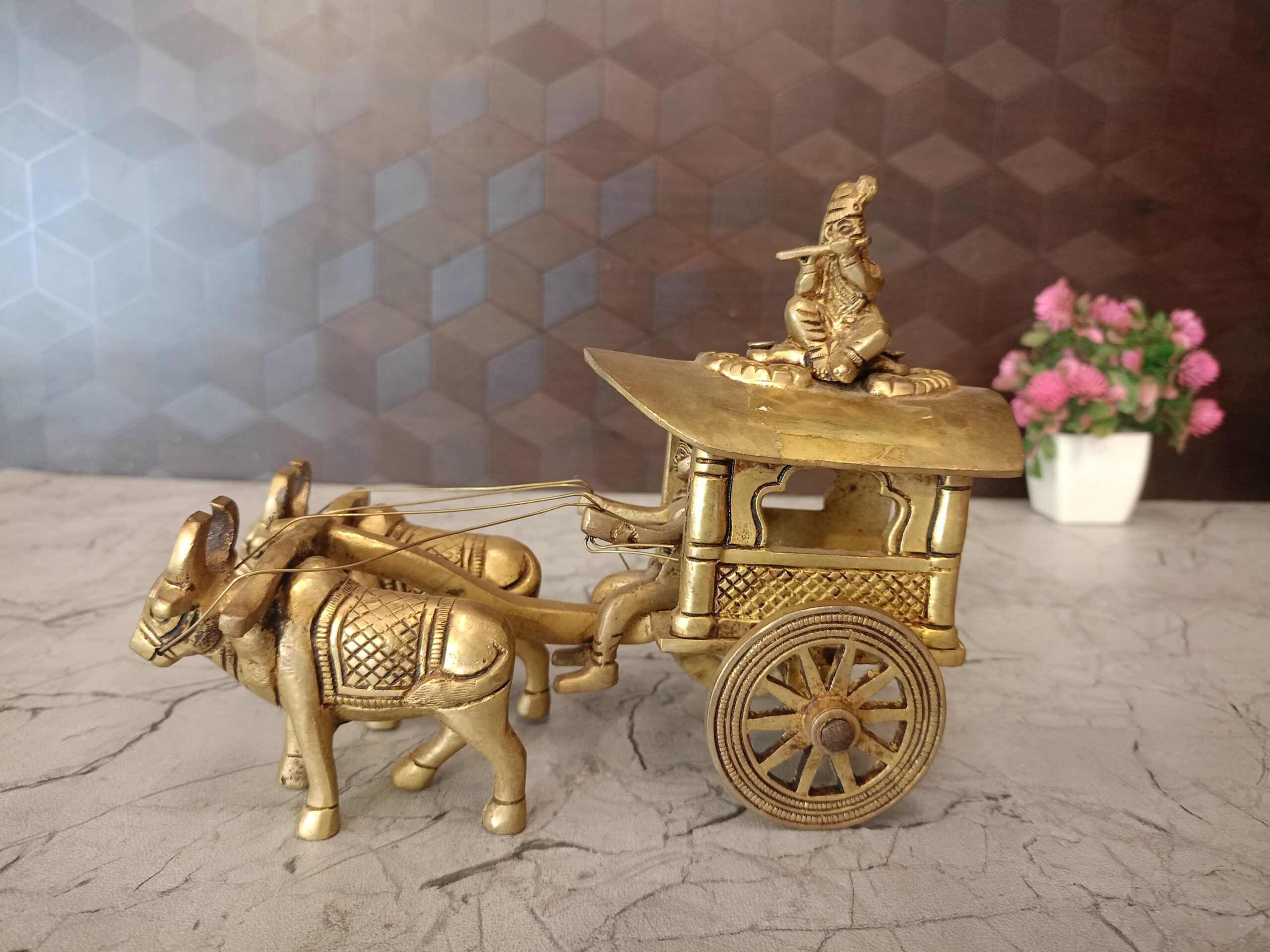 Brass Bullock Cart Krishna Idol is with the double bull, with two wheels, and with lord Krishna sitting on the top and playing bansuri. We can keep this in the office for a silent vibe and decoration purposes also. It gives a royal look with its impressive designs and it is made by talented craftsmen of India.