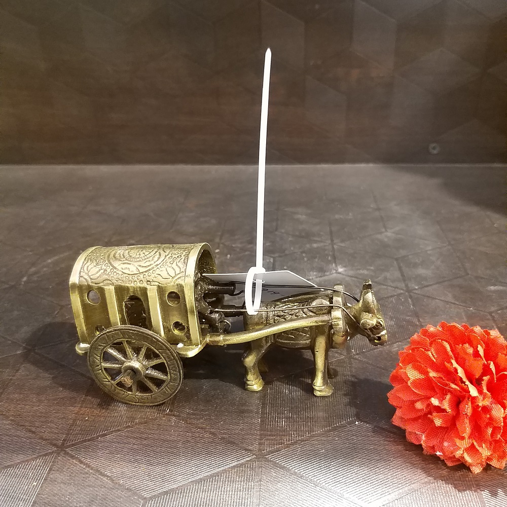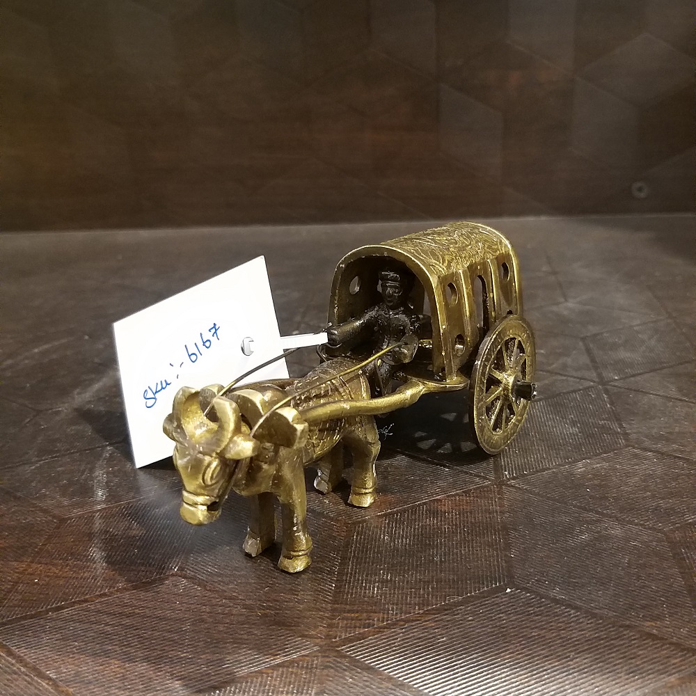 Brass Bullock Cart Small Brown Color is made of pure brass metal and it has a brown antique finish adorable for your home. This small showpiece is handcrafted in a designer and traditional way of famer riding two bulls. The Bullock cart is carved with a simple and elegant design.