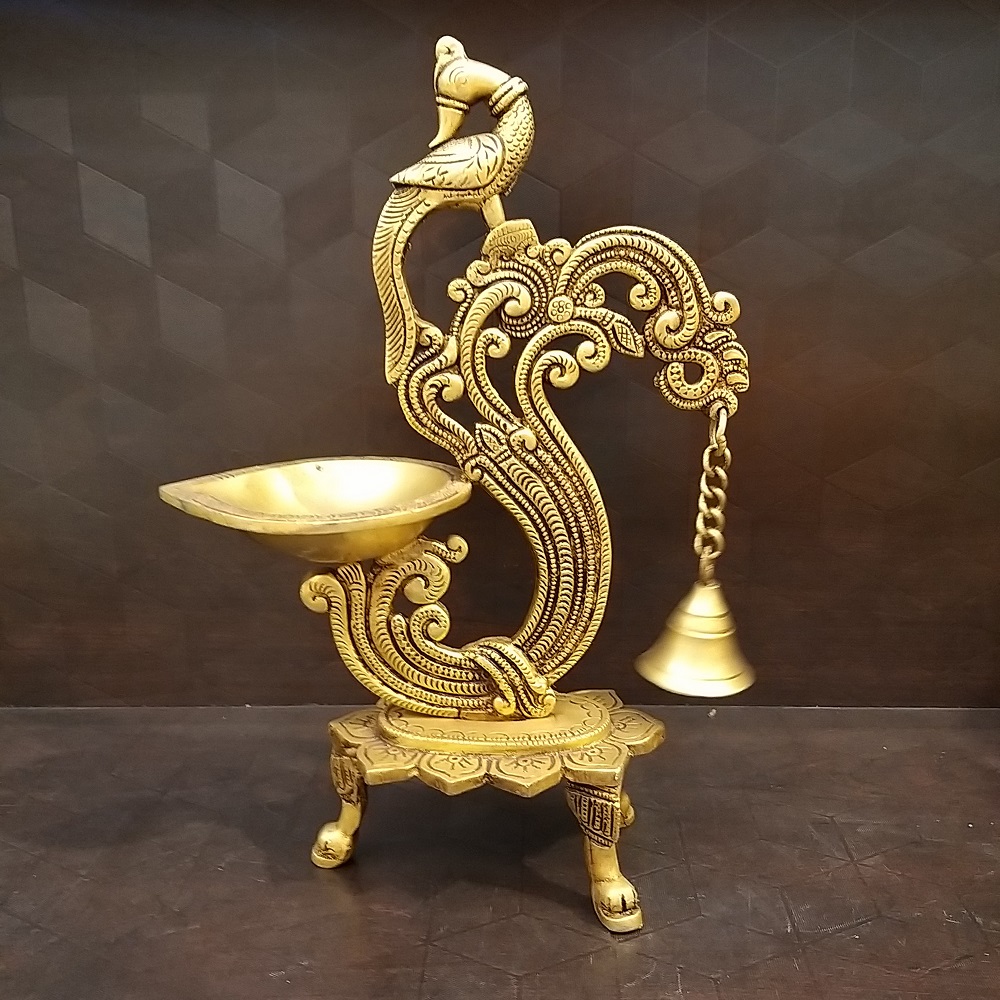 Brass Diya With Bell In Flower Base Idol is designed with the thought of making your home more beautiful and rich. The carvings and designs of the Diya and the attached bell and peacock are more unique parts of the Diya.