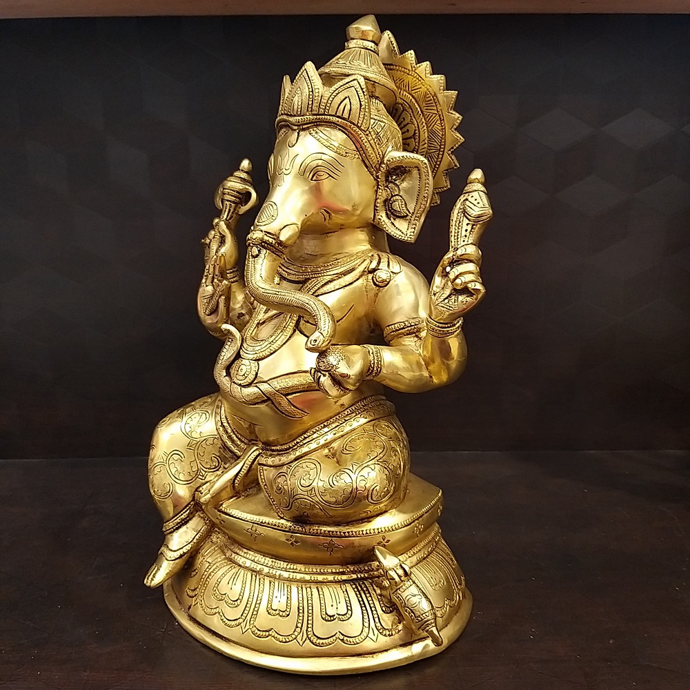 Brass Ganesha Big Statue is depicted to be seated in a lalitasana position by holding one leg and another leg over a lotus petal, where his vehicle mooshika is placed beside his leg. This brass statue of Ganesha is shown seated over a fully bloomed beautiful lotus flower. This Ganesha brass idol is carved with adorable designs portraying a royal look.