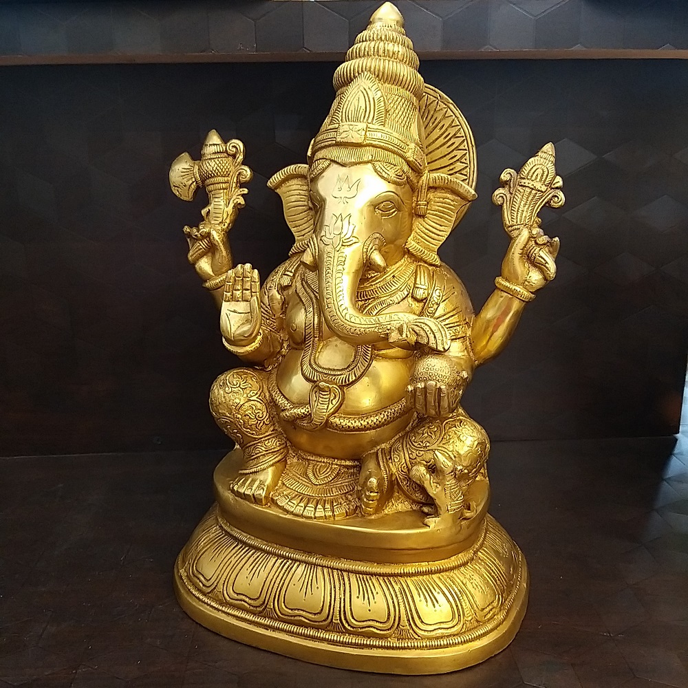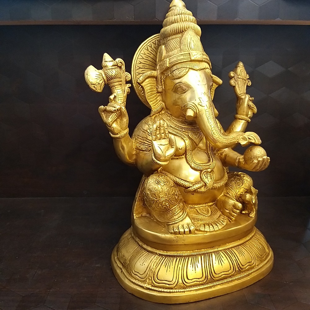 Brass Ganesha on Base Golden Finish Statue-15″