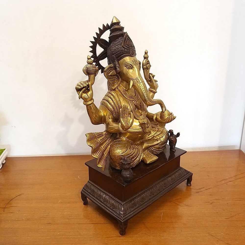 Brass Ganesha is carved with a brown antique and it has a unique enhancing design of crown and jewelry. This brass Ganesha is depicted in the way where he is sitting on the base. The base and crown of the Ganesha have the same brown antique color. Brown antique gives exactly superfine finish and detailing carving works.