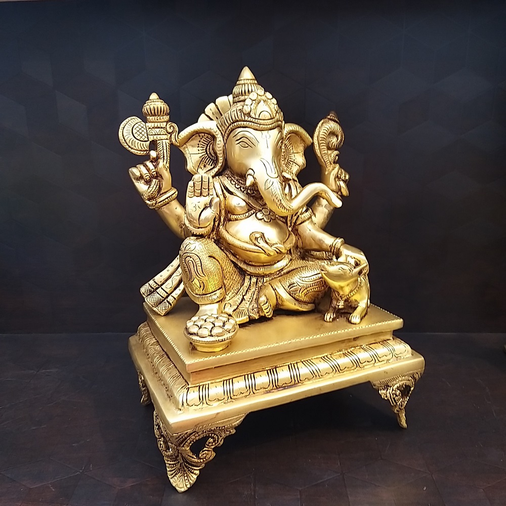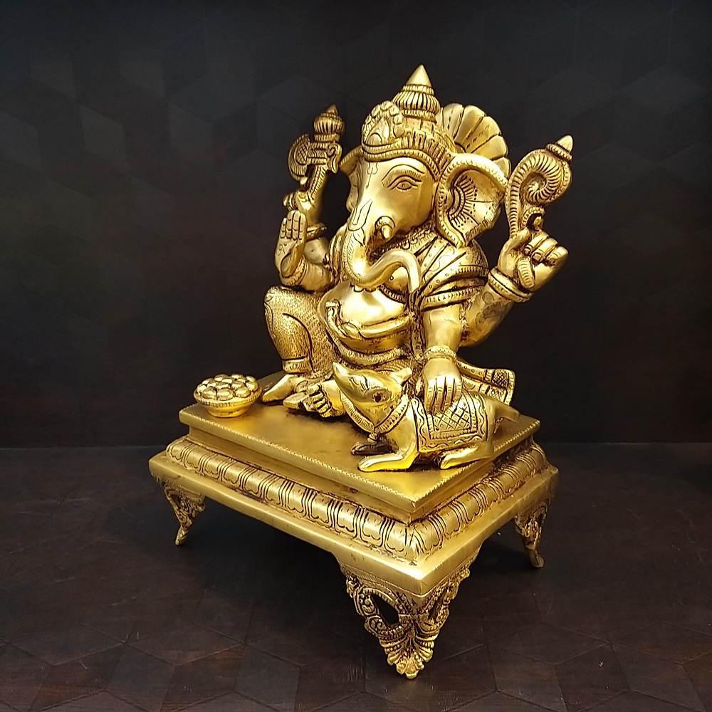 Brass Ganesha With Chowki Base Idol- 11.5″