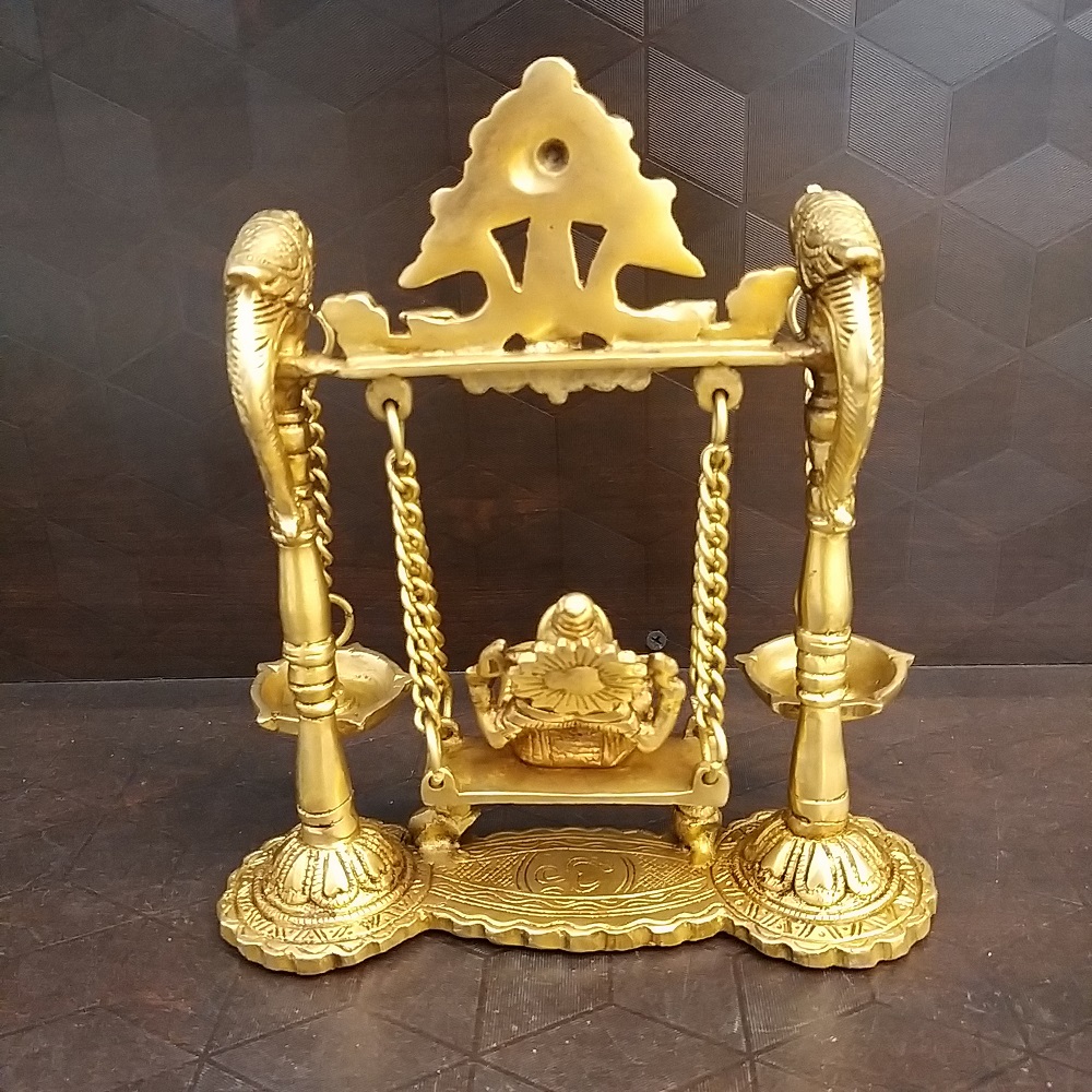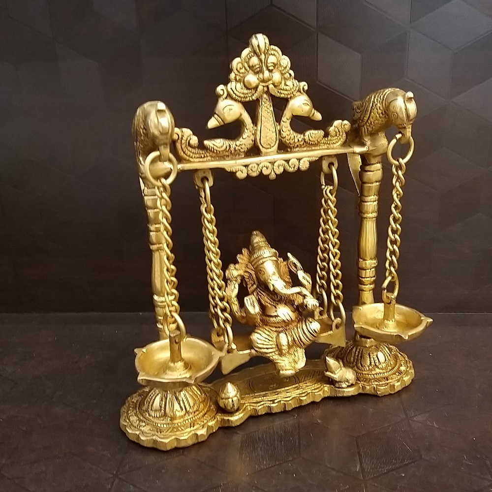 Brass Ganesha with Deepak Jhula Idol is depicted on the swing, it is attached with a designer arch and five faces small two diya’s. Diya’s also handcrafted with brass and hanging with a chain.