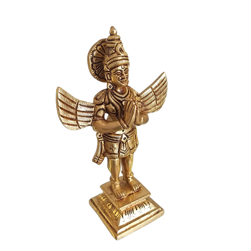 Brass Garuda Idol is the mount (Vahana) of Lord Vishnu and carries him along with his consort Goddess Lakshmi on his shoulder. This brass idol of Garuda is depicted in a way of the human body with an eagle face and feathers.