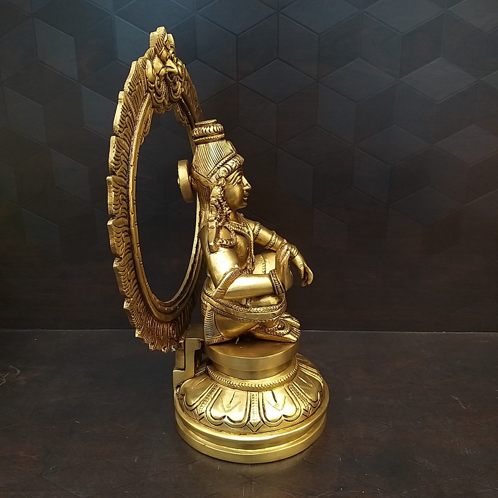 Brass God Ayyapan with Arch is the Hindu warrior god, particularly popular in the state of Kerala. Ayyappan is also referred to in various other names such as Ayyappa, Sastavu, Hariharaputra, Manikanta, Shasta or Dharma Shasta. Lord Ayyappan is also known as Hariharaputra meaning the “son of Harihara” who is born to Lord Shiva and Mohini the female form of Lord Vishnu).