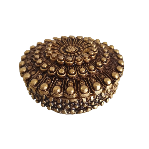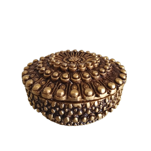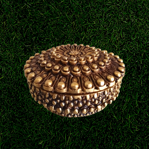 Brass Jewel Box is round shaped is an open type box in which it has hollow inside it to organize things. This jewel box contains intricate carving of floral designs both on the top and outside the box. This can be used for multipurpose.