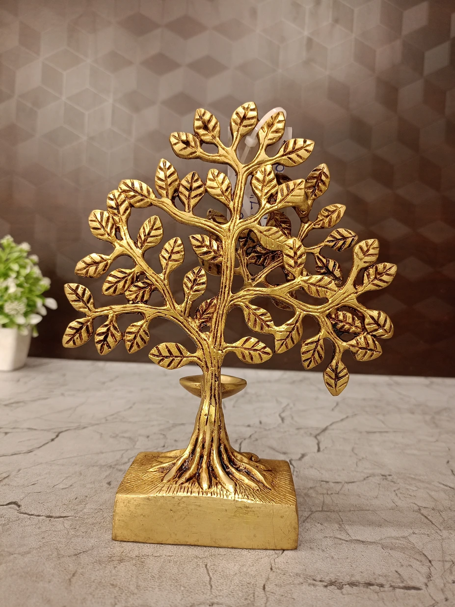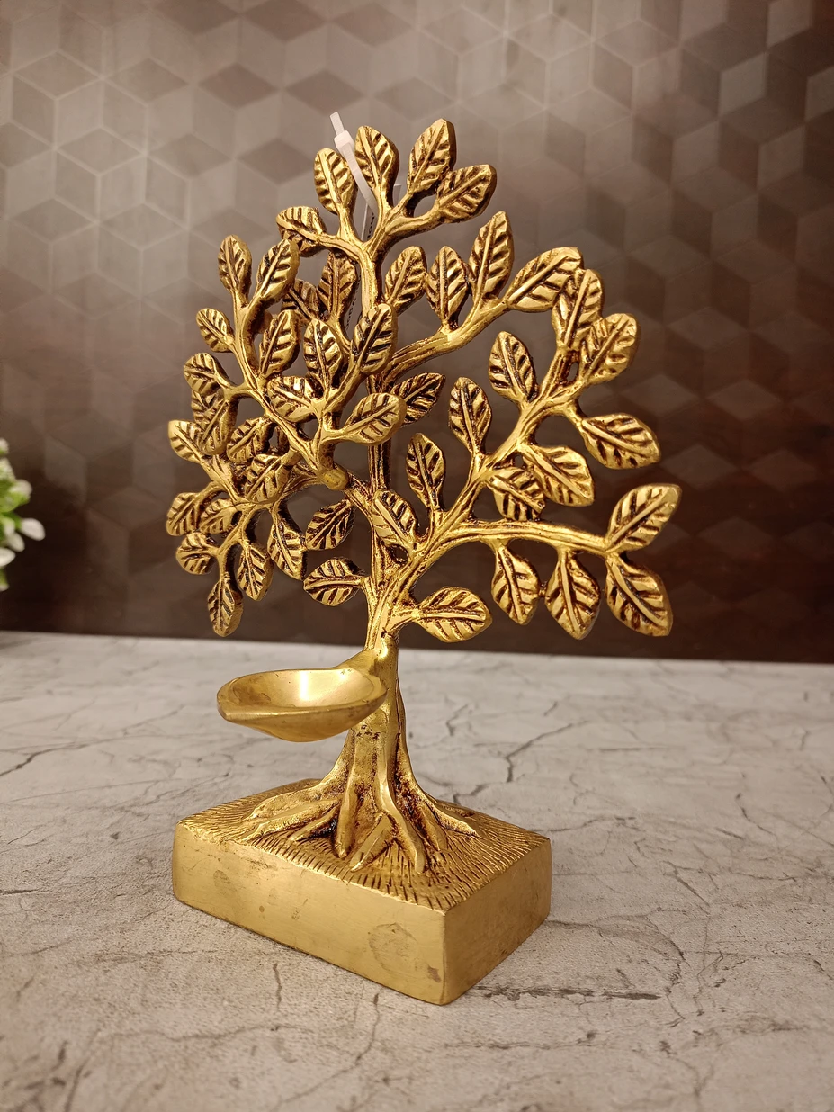 Made from premium quality brass, this elegant tree features intricate detailing and a traditional diya at its base, representing the removal of darkness and the arrival of positivity. Its compact 7-inch size makes it perfect for pooja rooms, home temples, office desks, living rooms, and vastu decor.