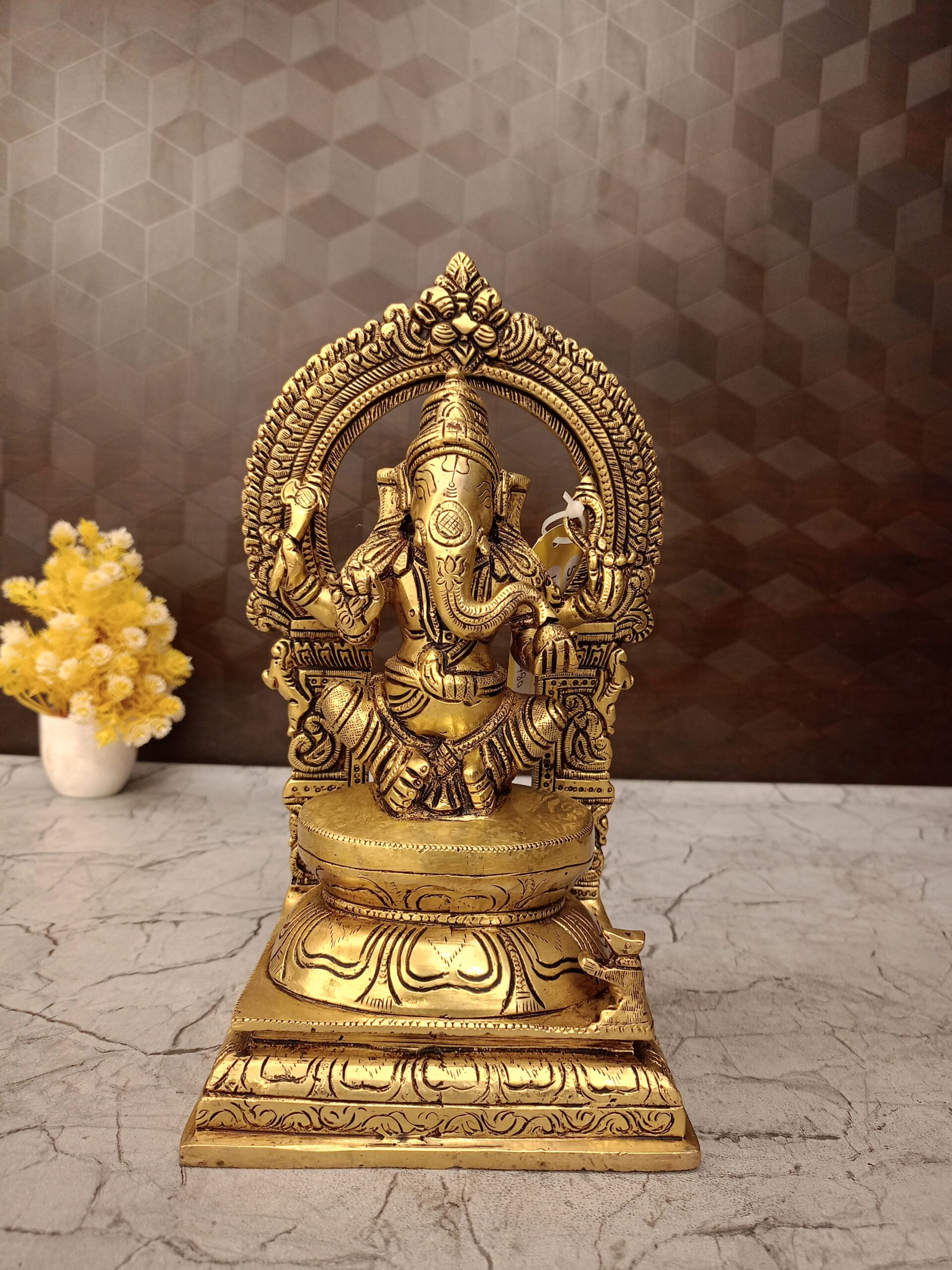 Brass Lakshmi Ganesha Saraswathi Set contains three gods and goddesses together namely Lord Ganesha, Goddess Lakshmi and Saraswati. All the three divine statues are depicted in a sitting position over an artistically created base below them and an arch behind them.