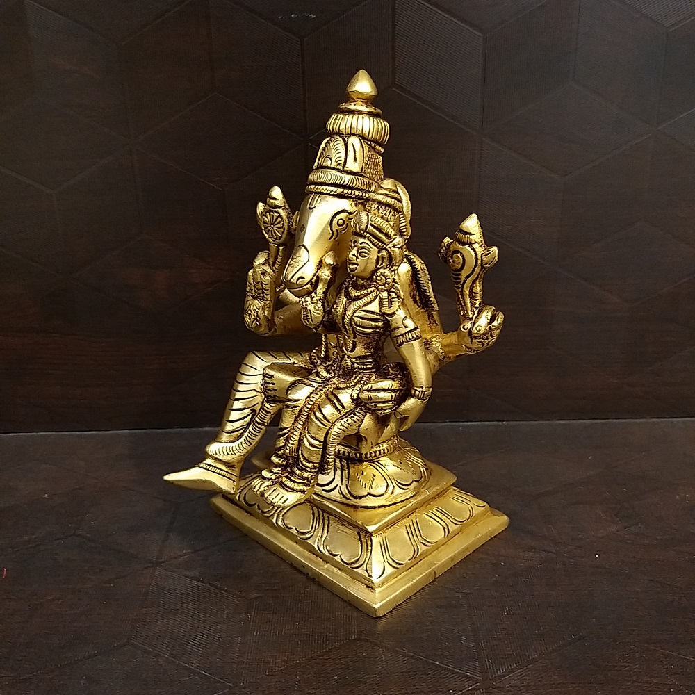 Brass Lakshmi Hayagreevar Idol is portrayed with a horse-necked avatar where he has got a Human body with a Horsehead. This brass idol of Lakshmi Hayagreevar got his name by the way he is seated along with his consort Lakshmi on his lap.