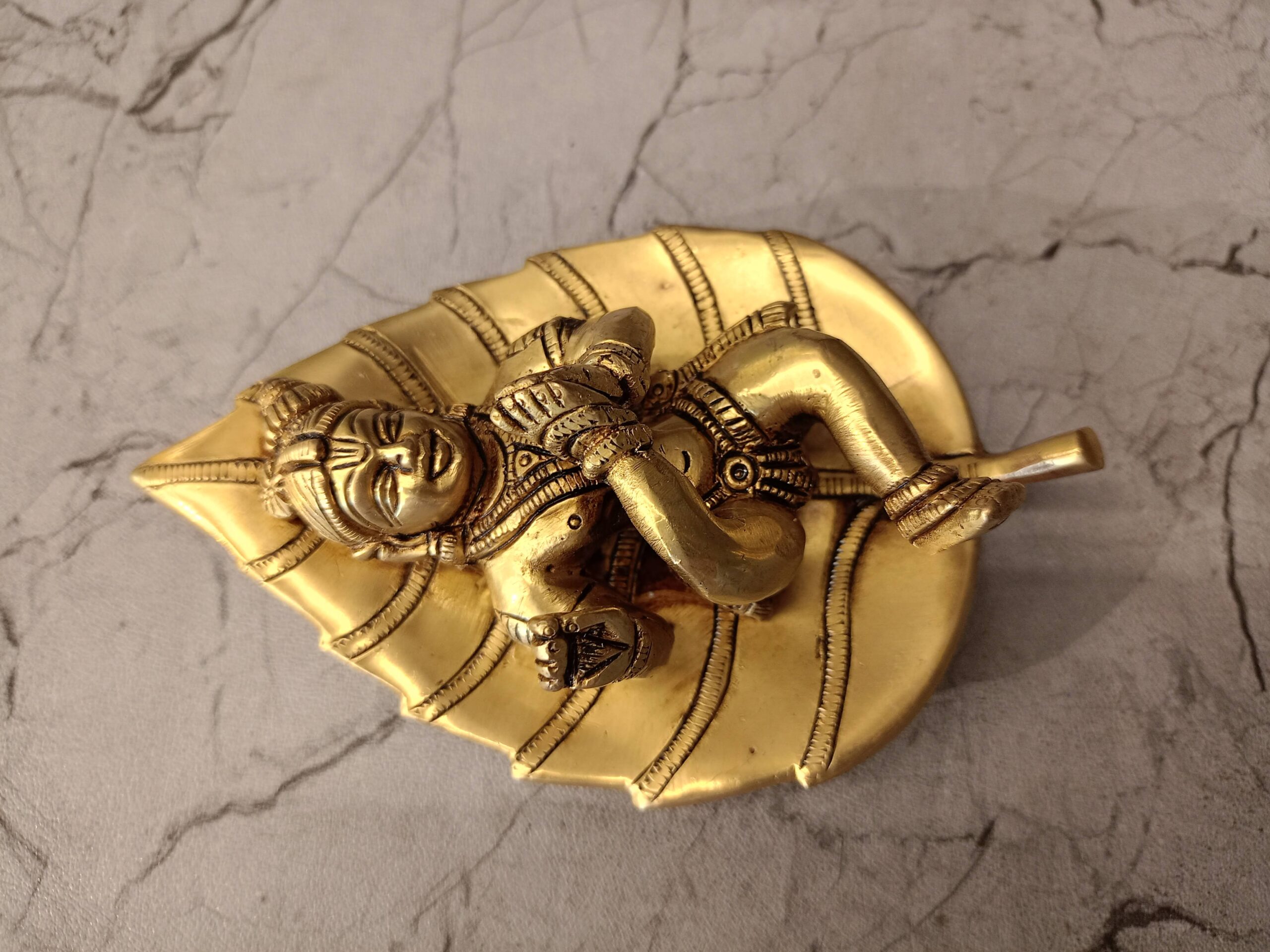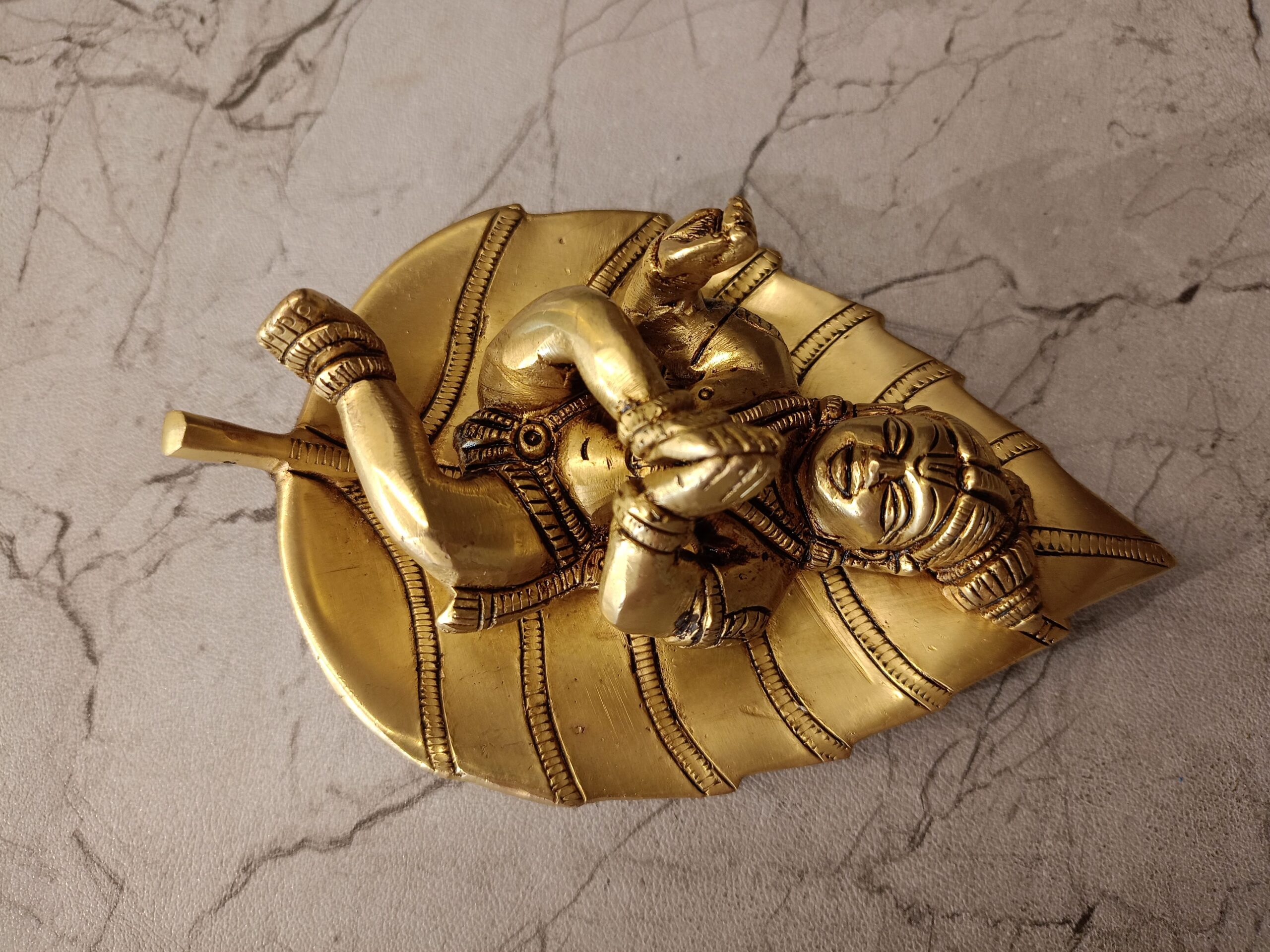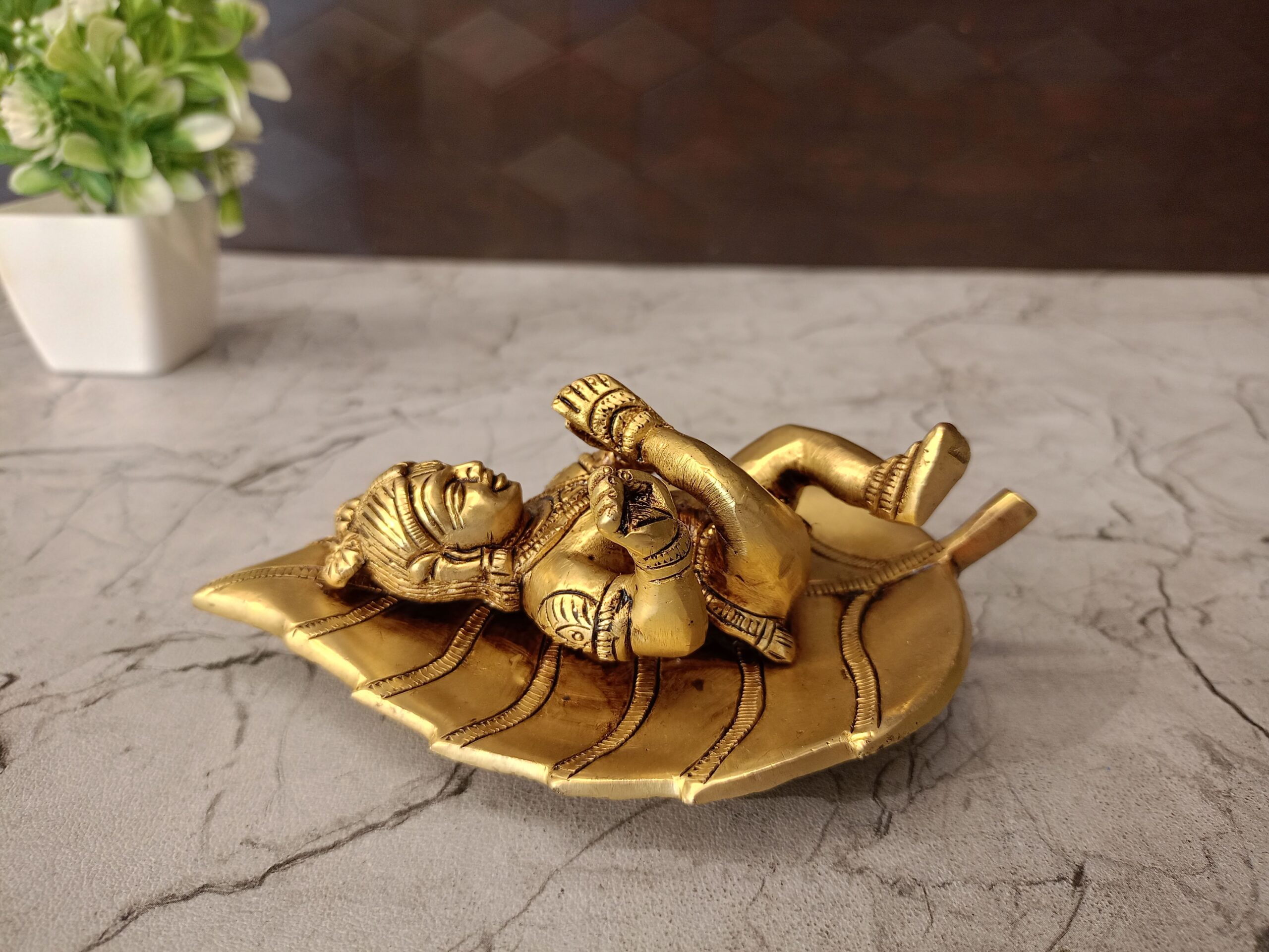 A brass idol of Baby Krishna lying on a leaf, also known as Vatapatra Shayi Krishna or Alilai Krishna, is considered highly auspicious and beneficial for several reasons:
