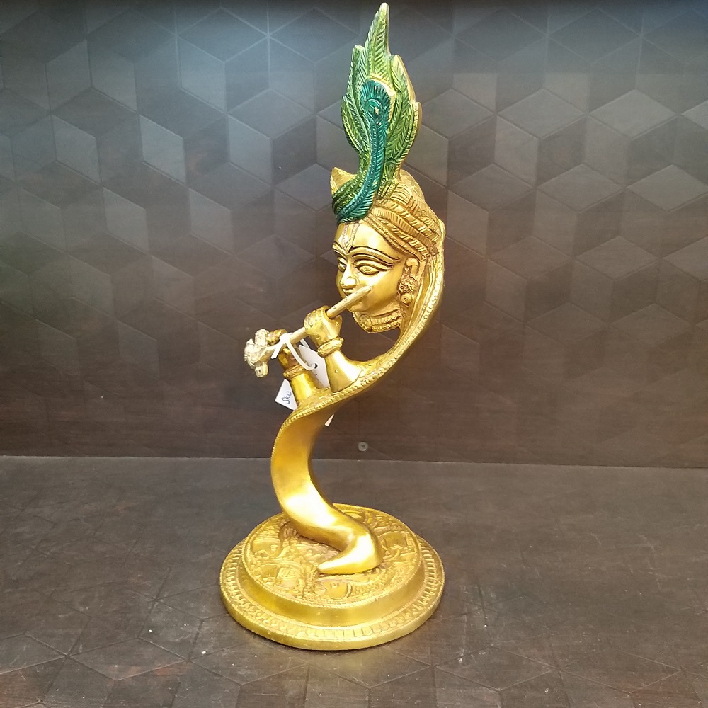Brass Modern Krishna Under tree Statue is depicted in the way where Krishna’s head is attached to a turban, and the peacock feather has a green color.
