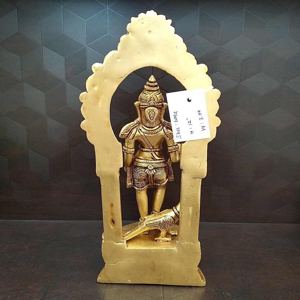 Brass Murugan Silai is depicted in a standing form with a beautifully decorated arch carved with the design of Yazhi and tribal patterns. The base of this brass Murugan statue is square-shaped with an inverted lotus design. This brass Lord Muruga statue is seen with 4 hands showing Abhaya Varada Mudra and holding battle weapons along with divine spear vel and his vahana peacock.
