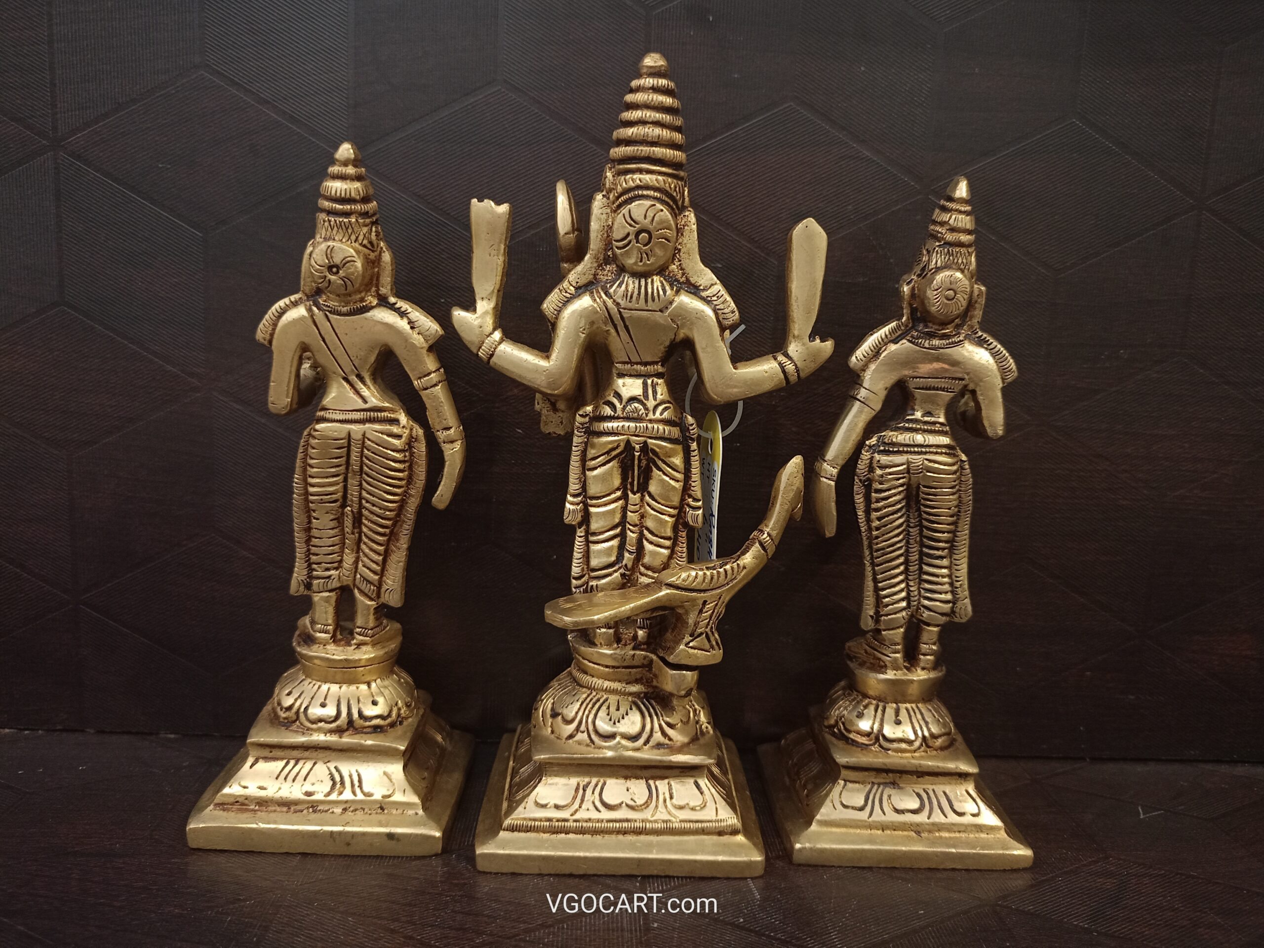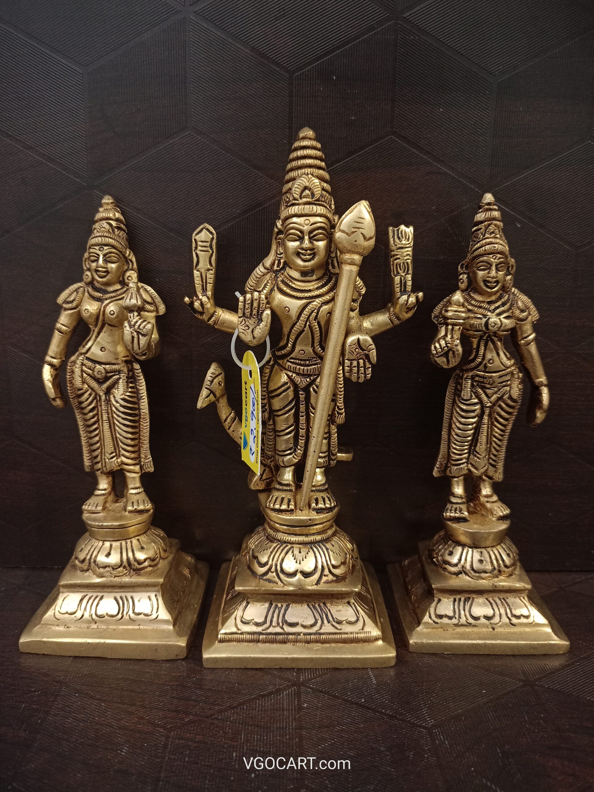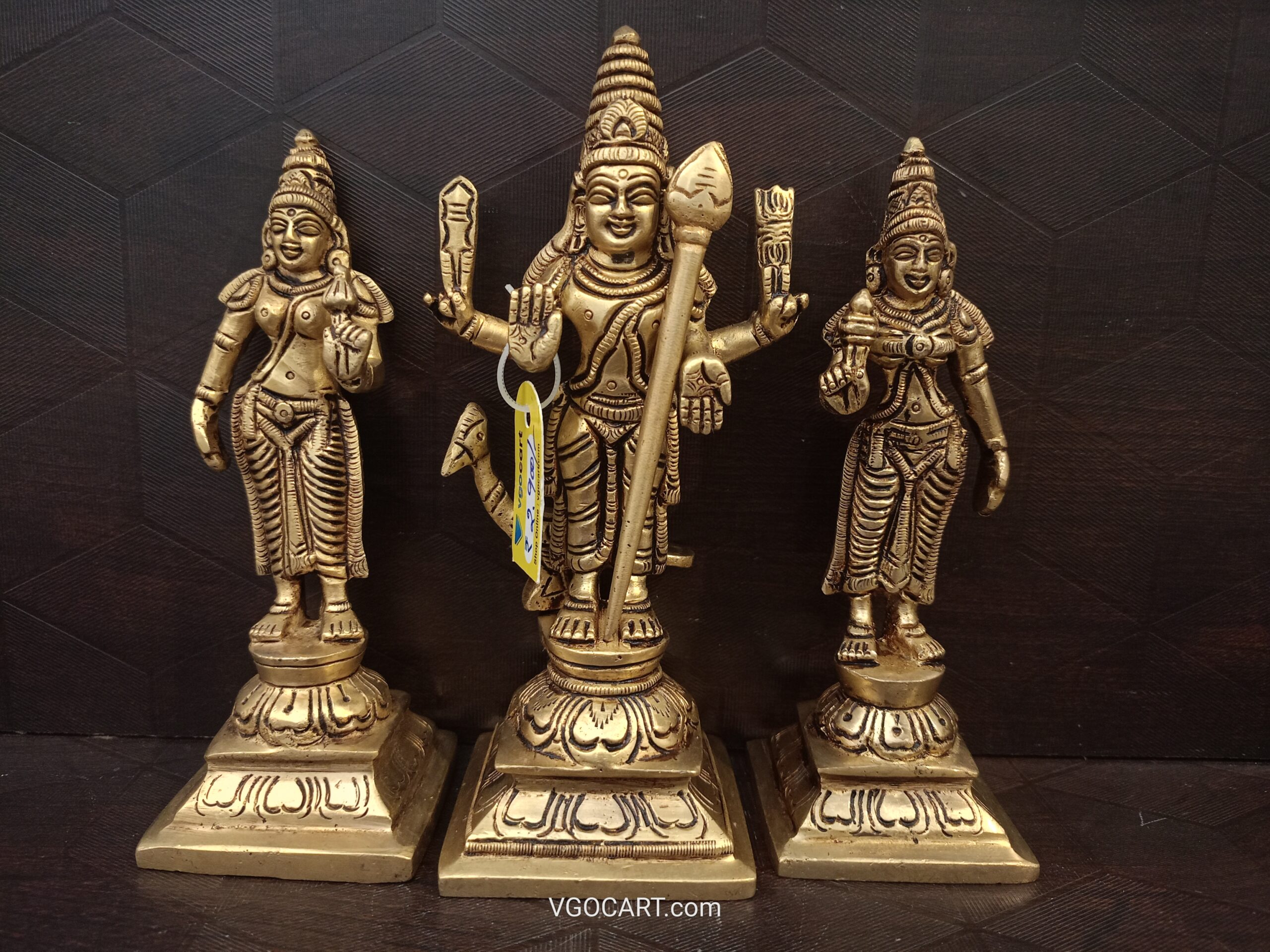 This brass idol of Murugan statue is engraved with simple and elegant designs carved in the iconography of three deities as a whole which brings a gorgeous divine look to the place where it is kept.