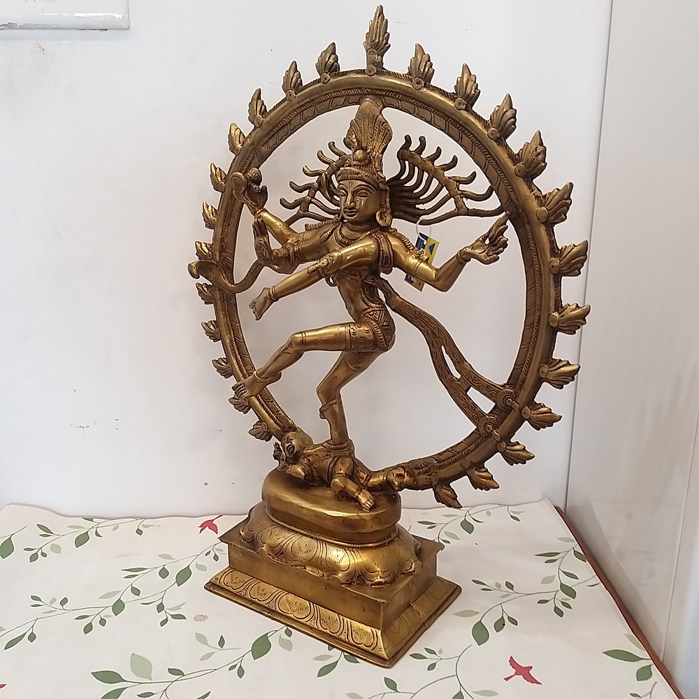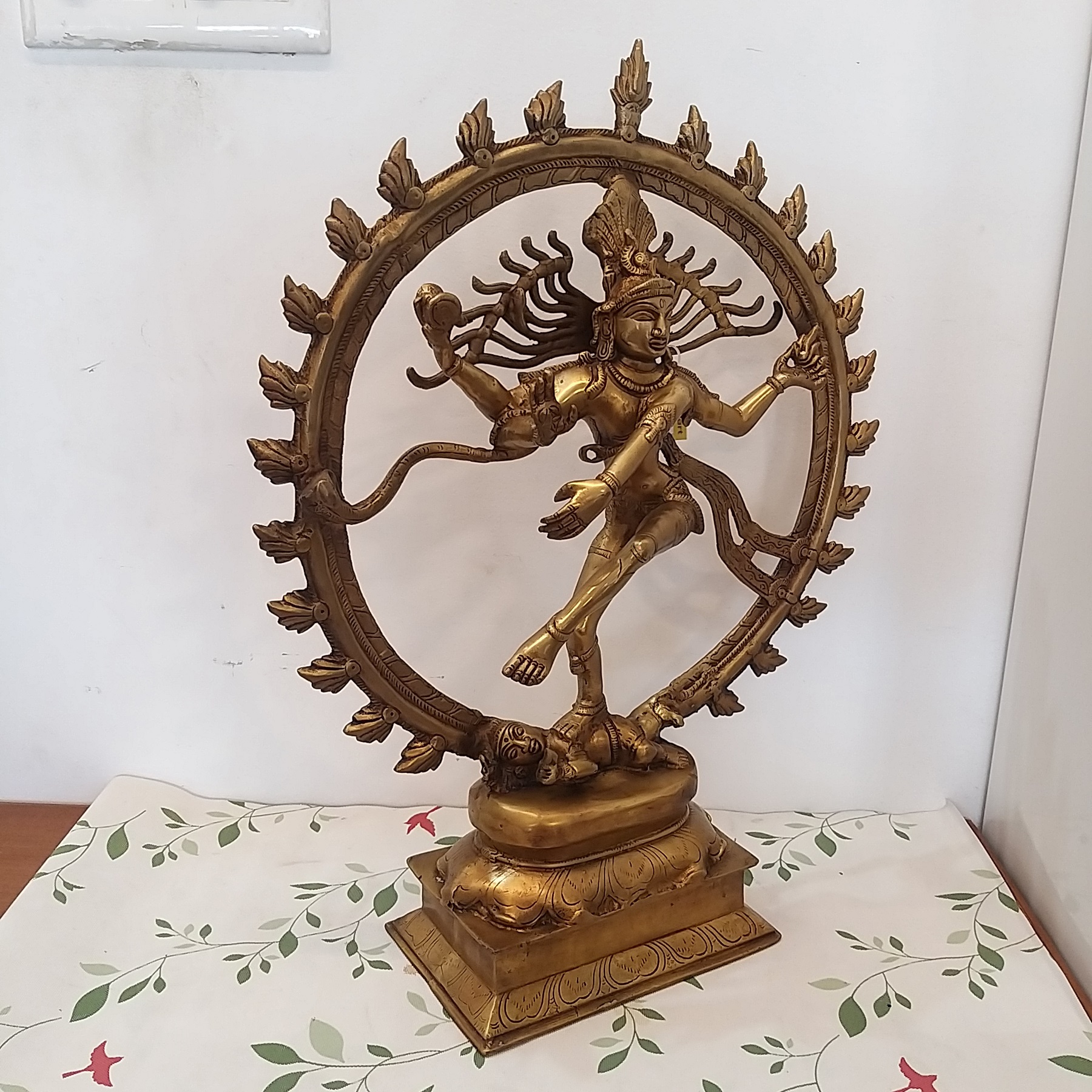 In this brass sculpture, he has 4 hands in which two hands will be holding damaru and fire and showing Abhaya mudra (for protection and liberation). Hence he is termed as the king or lord of the dance. Lord Nataraja’s gentle form of dance is called Lasya and the violent form of dance is called Thandavam.