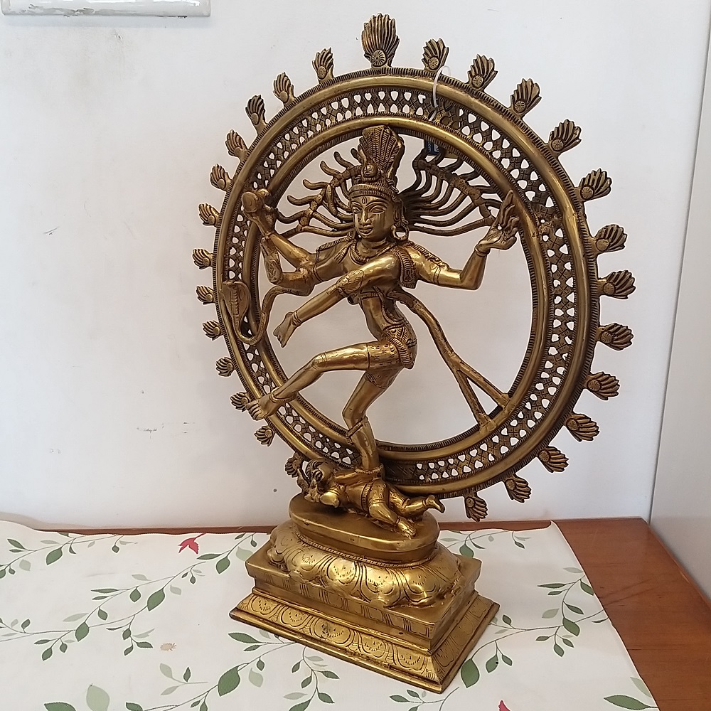 In this brass sculpture, he has 4 hands in which two hands will be holding damaru and fire and showing Abhaya mudra (for protection and liberation). Hence he is termed as the king or lord of the dance. Lord Nataraja’s gentle form of dance is called Lasya and the violent form of dance is called Thandavam.