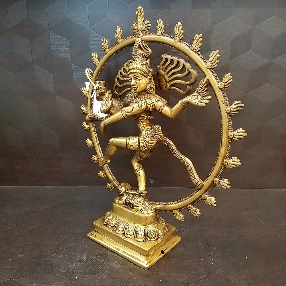 Brass Nataraja idol is depicted in the way where the demon called Muyalaka is under the feet of Lord Shiva, and he is on anger in the position of dancing.