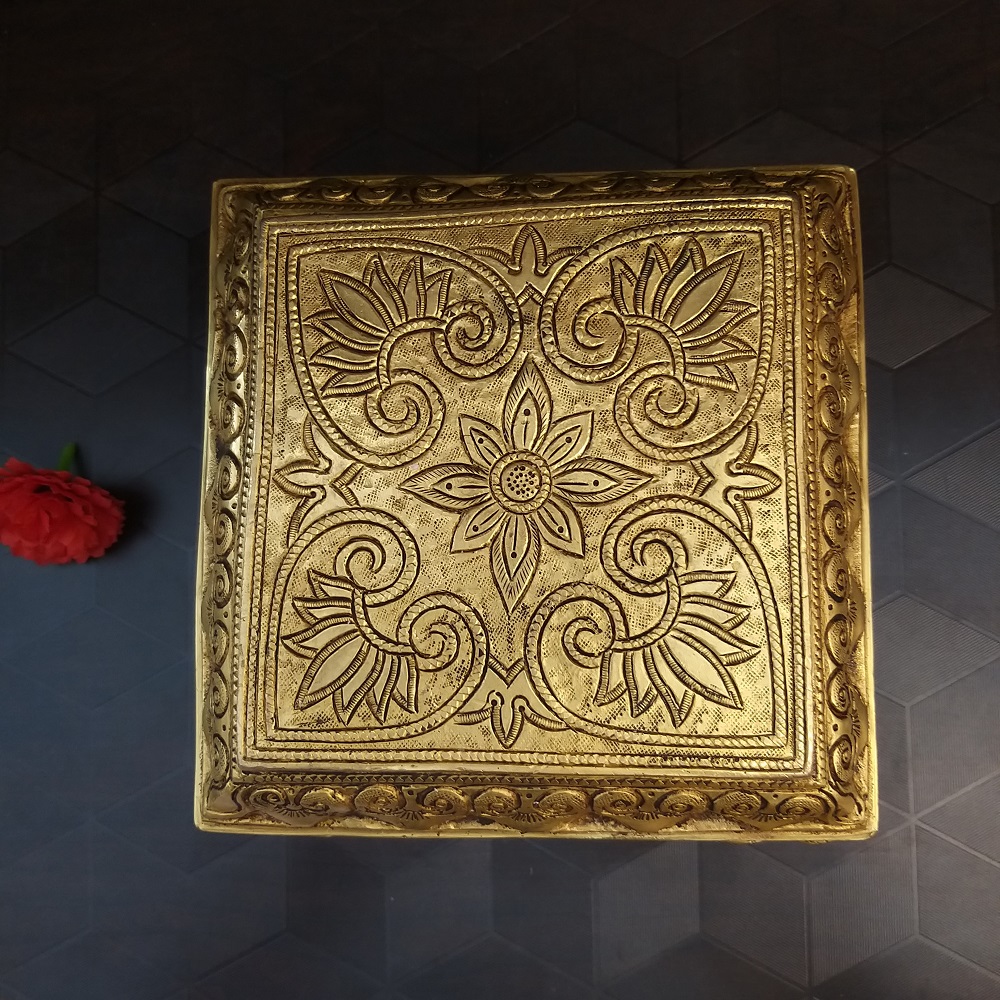 Brass New Chowki Stand small idol designed with four legs called Narkali. It is carved with black antique carvings like circles and squares. This brass chowki is handcrafted in square shapes.