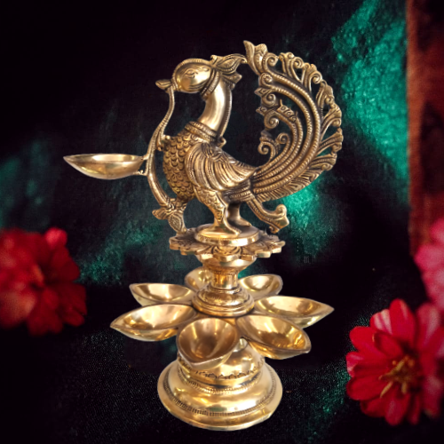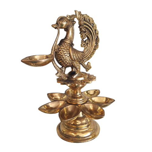 Brass Peacock Diya unique piece of peacock Diya is depicted in a way where a five face Diya is attached with the structure of a peacock with intricate carvings and adorable designs. The peacocks in this brass Diya are handcrafted with every detailed carving that creates a royal look to it.