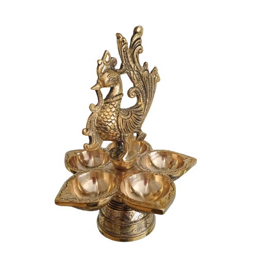 This Brass Peacock Diya with 5 faces is depicted in a way where 5 faces of diya are attached with the structure of peacock at the top followed by a round stand that ends with intricate carvings and adorable designs. The peacocks in this brass Diya are handcrafted with every detailed carving that creates a royal look.