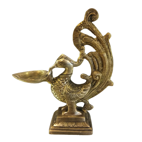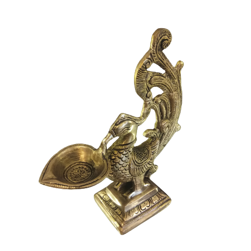 Brass Peacock holding diya is designed with brass metal by a great artisan of Vgocart, it is depicted in the form of a small and designer peacock holding diya with the help of a mouth. Peacock is standing on a square base and it has antique look carvings of the peacock statue is enhanced with this antique look.
