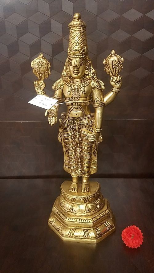 Placing this brass statue of Perumal at the entrance of the house or in the living room, pooja room, or office may help to increase wealth, prosperity, fame, and success. This Perumal brass idol can be a great gift for Vaishnava devotees.