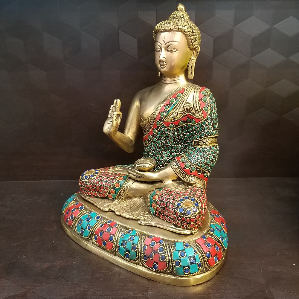 Brass Superfine Stone Blessing Buddha Small Idol on Designer Baseis handcrafted with brass metal and the stone works add extra beauty and refresh for the idol. Buddha statue is depicted the way in the position f Varaha mudra in the right hand and keeping the bowl in the left hand. This Varaha mudra resembles the emotions and best characterizes people examble welcome, charity, and sincerity.