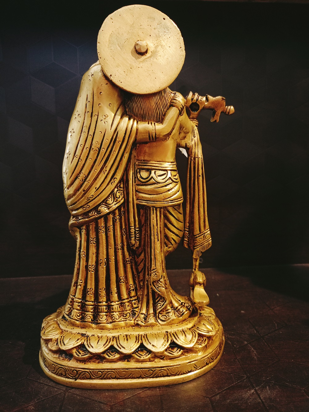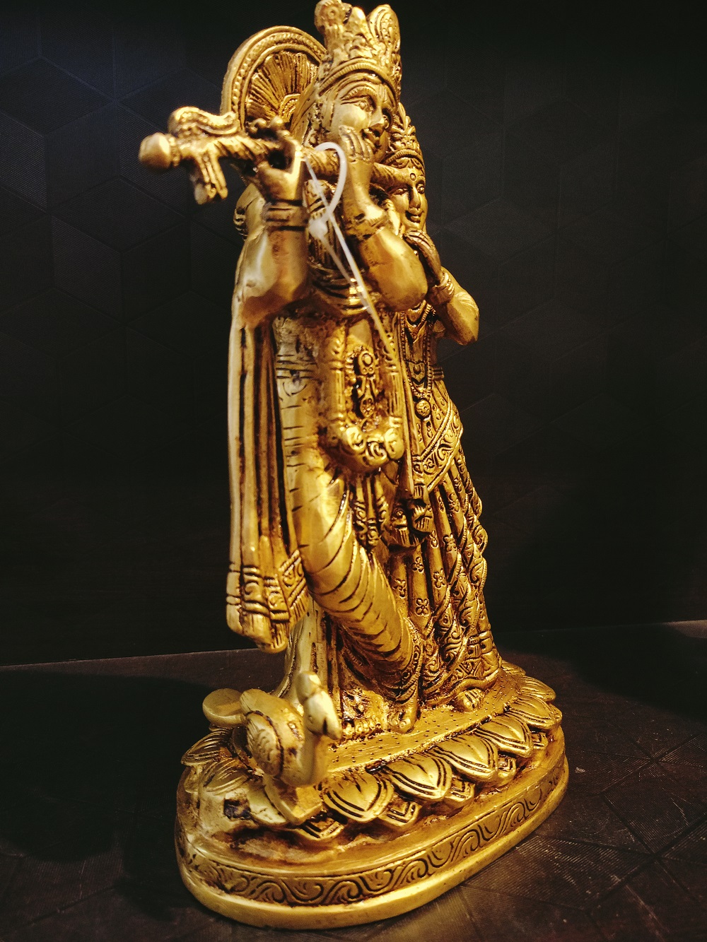 Brass Radha Krishna With Peacock On Lotus Base 10.5”