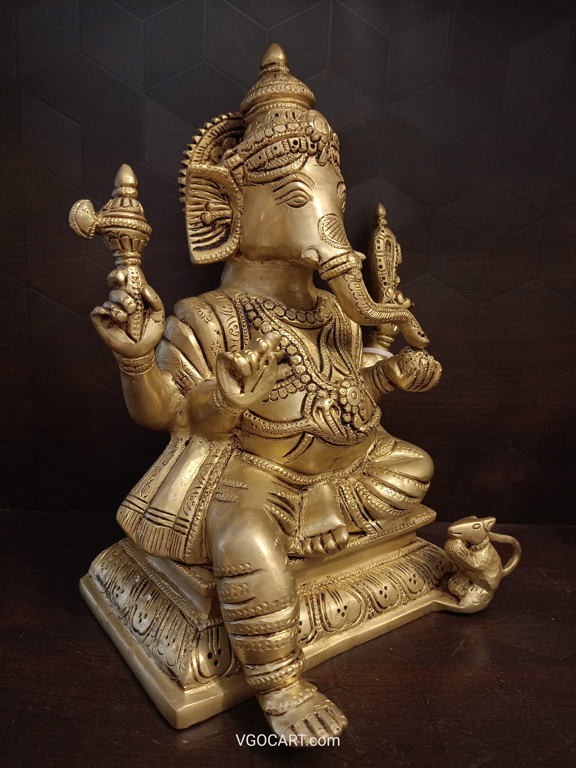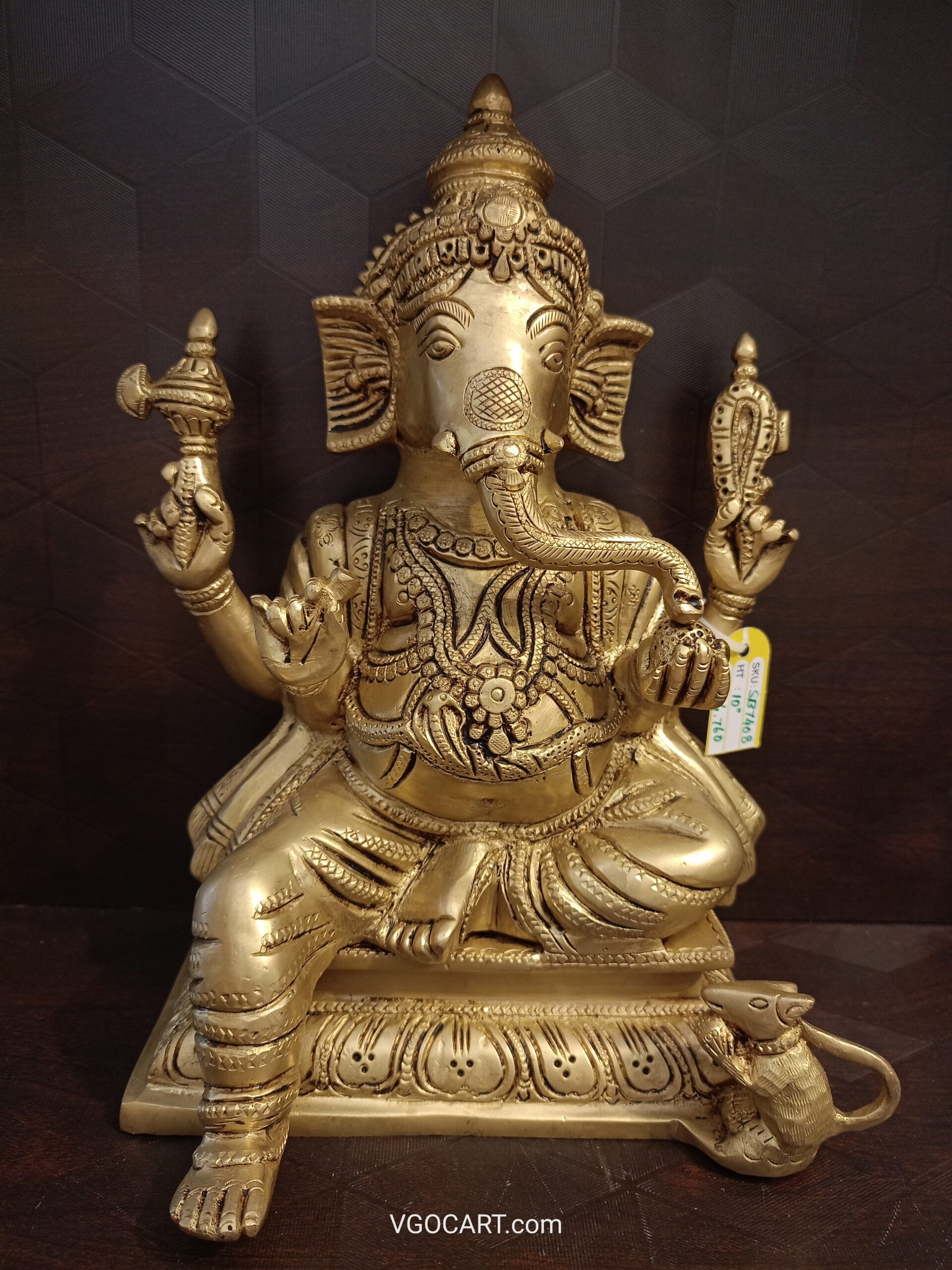 This brass ganesha statue is depicted in a sitting position over a beautifully carved base along with his mount mooshika vahana. This brass idol of lord ganesha has 4 hands holding the weapons of anushka pasankusha, his favorite sweet modak dumpling and showing abhaya mudra.