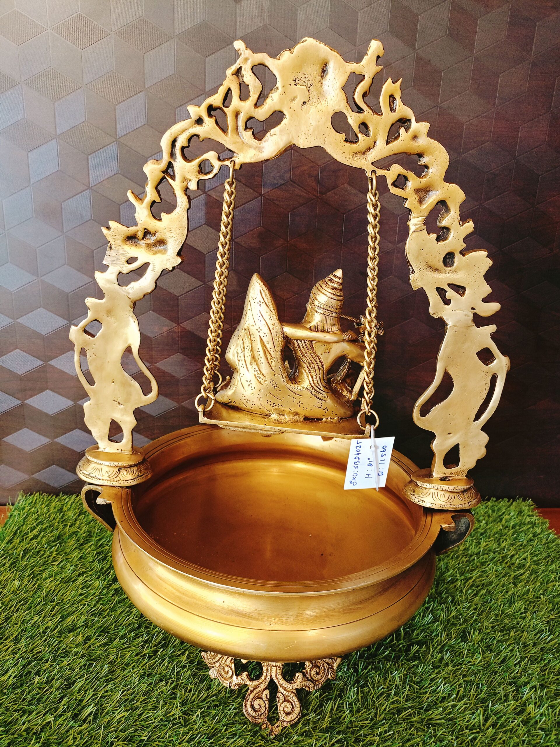 Brass Swing Radha Krishna Uruli Idol is depicted with an arch hanging by a swing where krishna and radha is seated together which stands as the center point of an attraction attached with a bowl to fill water along with designed carvings in its front and back region. This brass uruli have got a beautiful antique finish that brings a specific look.
