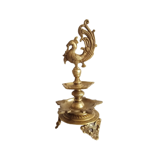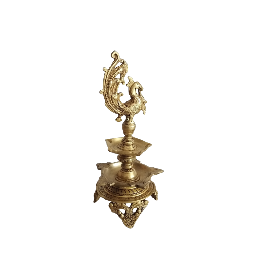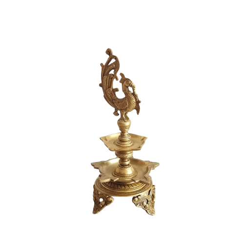 Brass Two Layer Peacock Diya is uniquely designed and made of premium brass metal and diya is depicted in a form of peacock is beautifully crafted in the up side of the diya and two layer five face diyas crafted in center above the base.