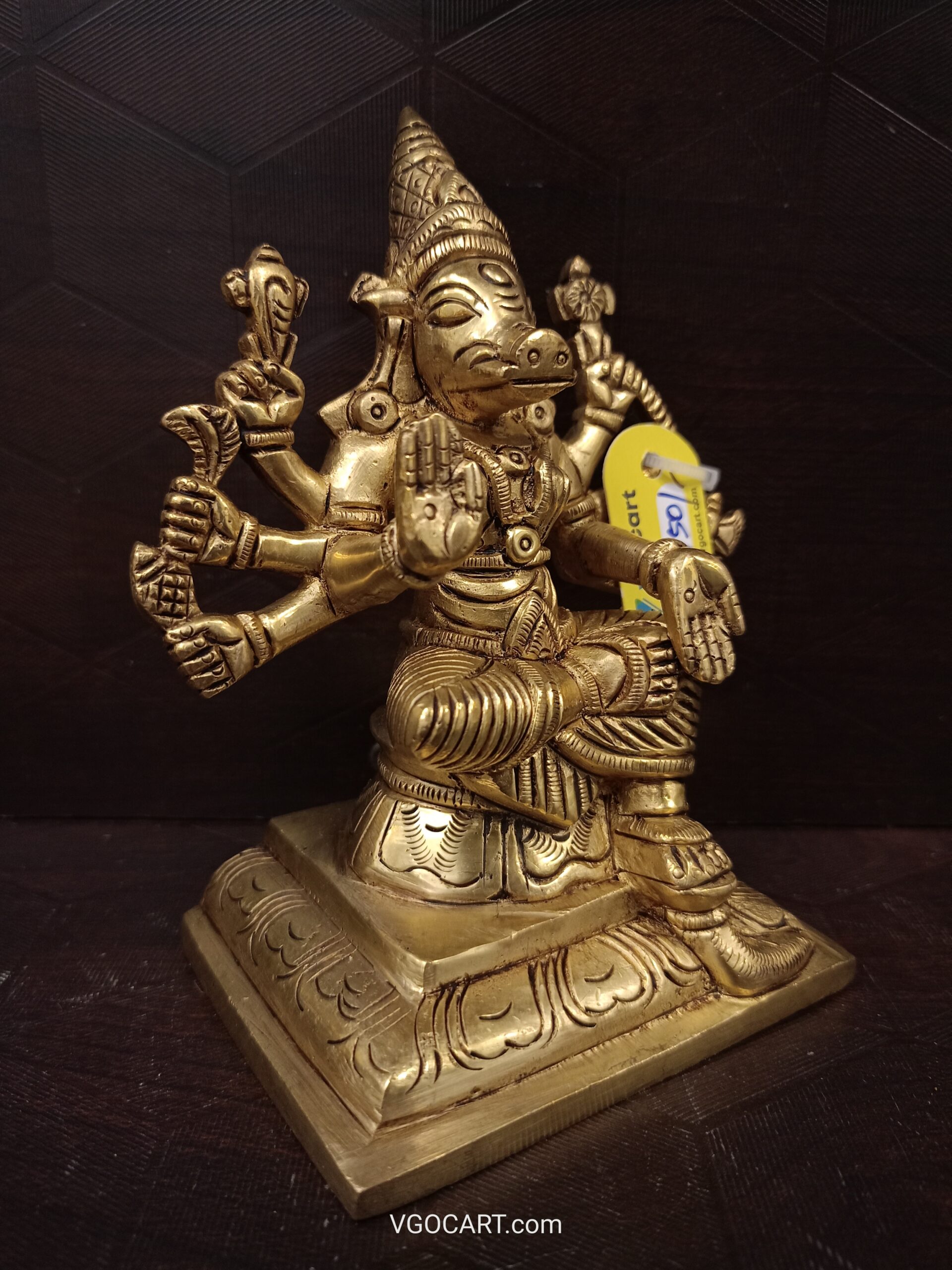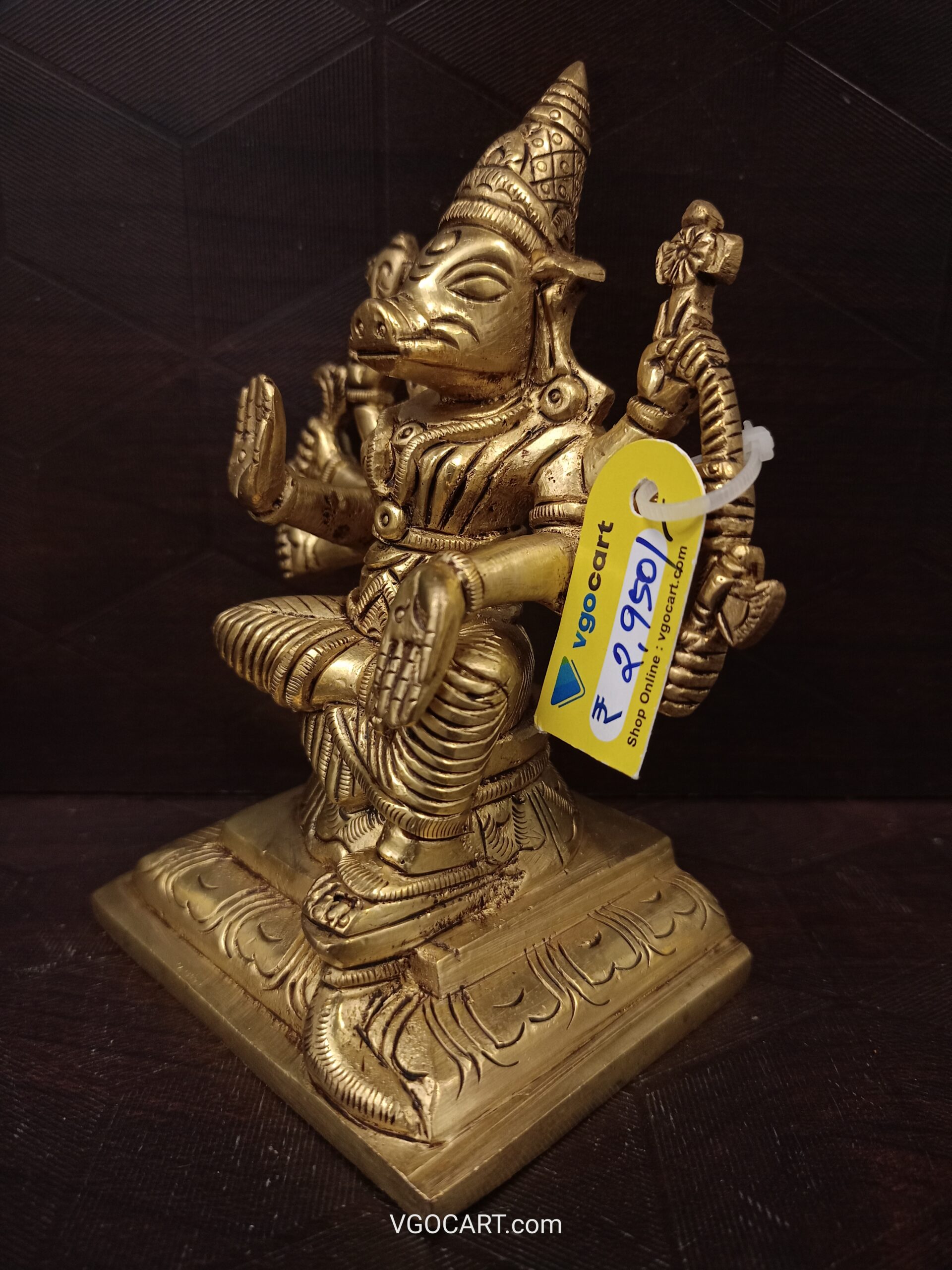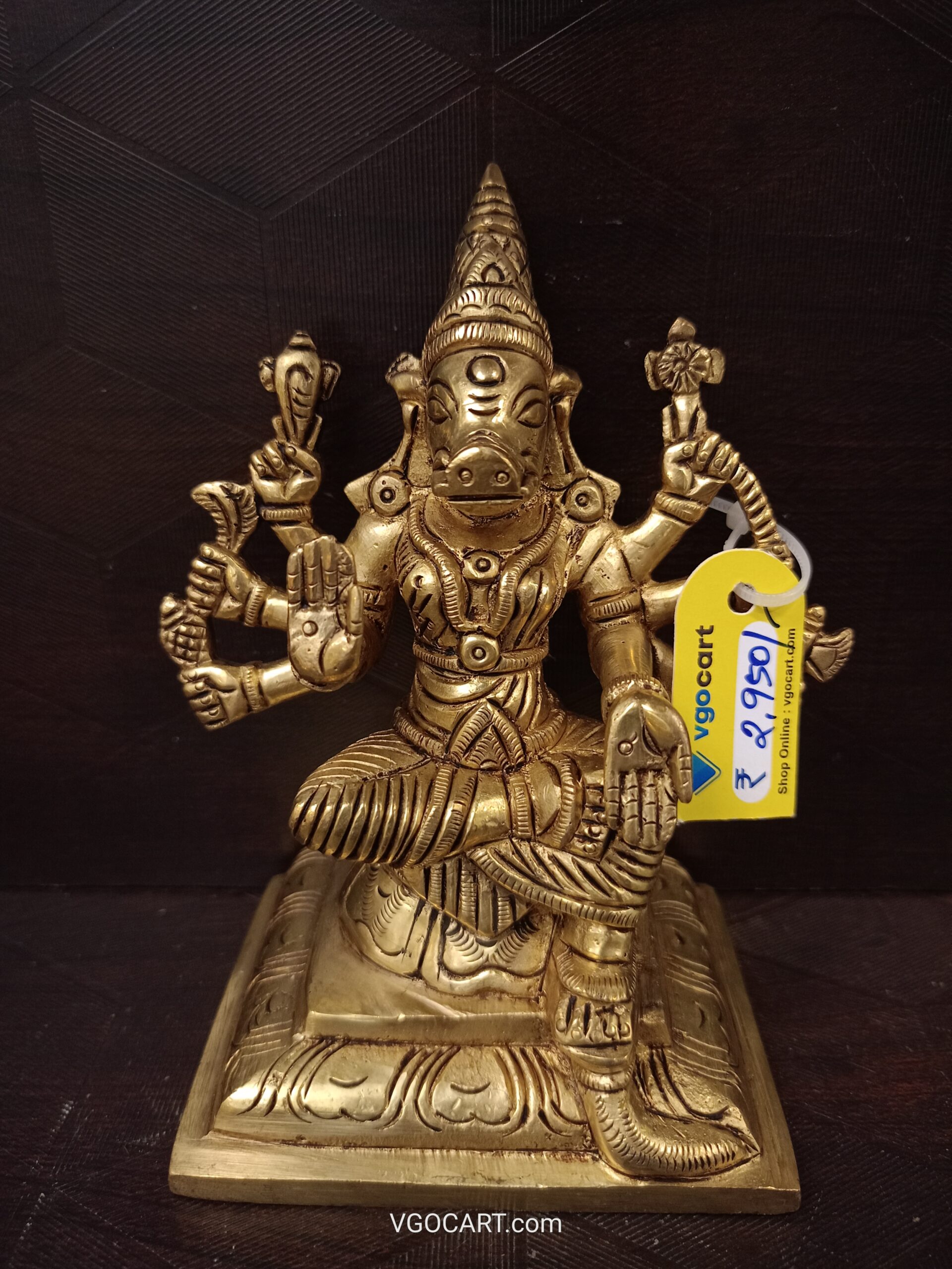 Brass Varaji Amman idol is a Hindu goddess and this brass small statue is designed with beautiful antique carvings, this black antique finish enhances the beauty of the idol. This is fully made of brass metal,