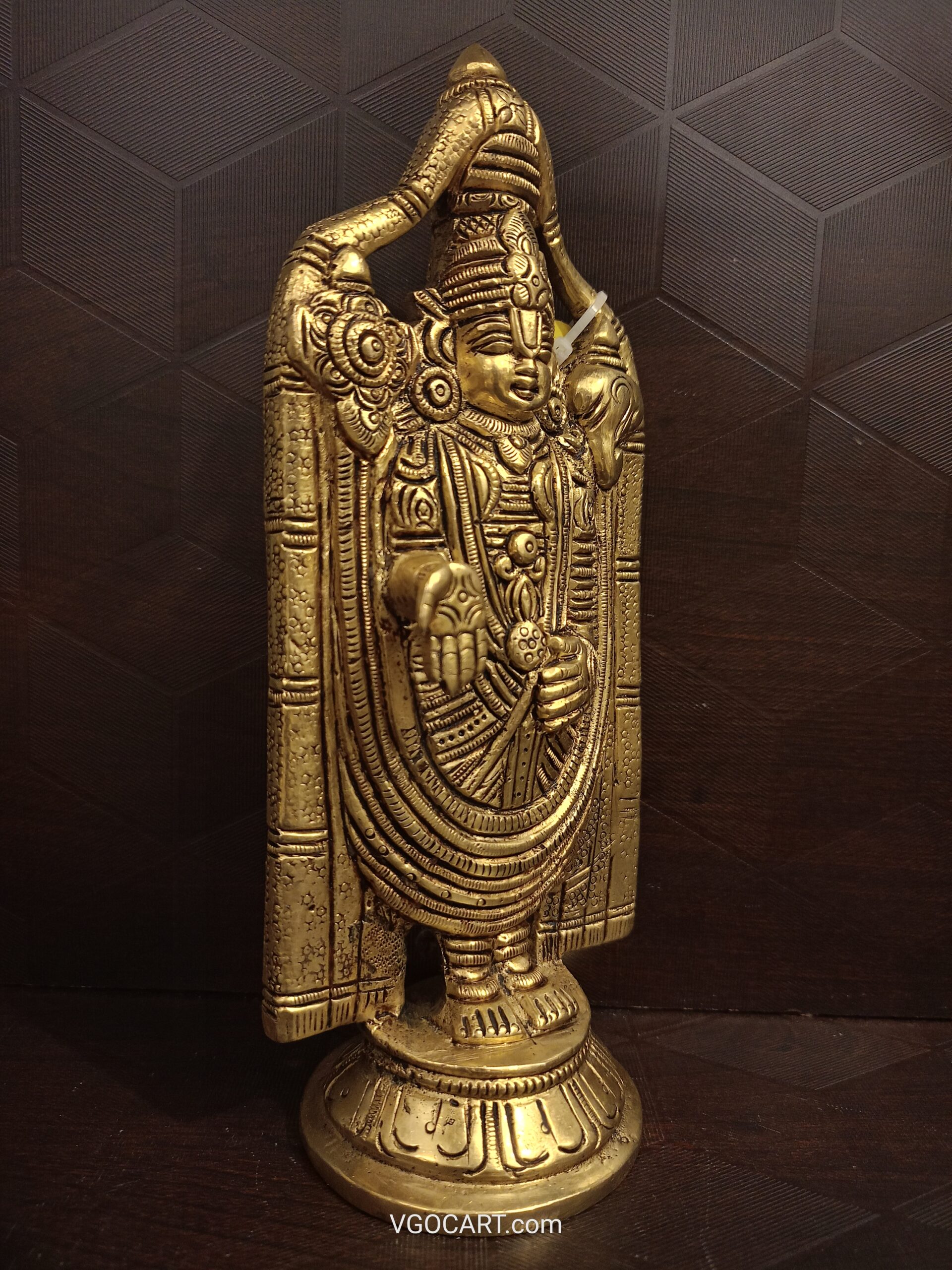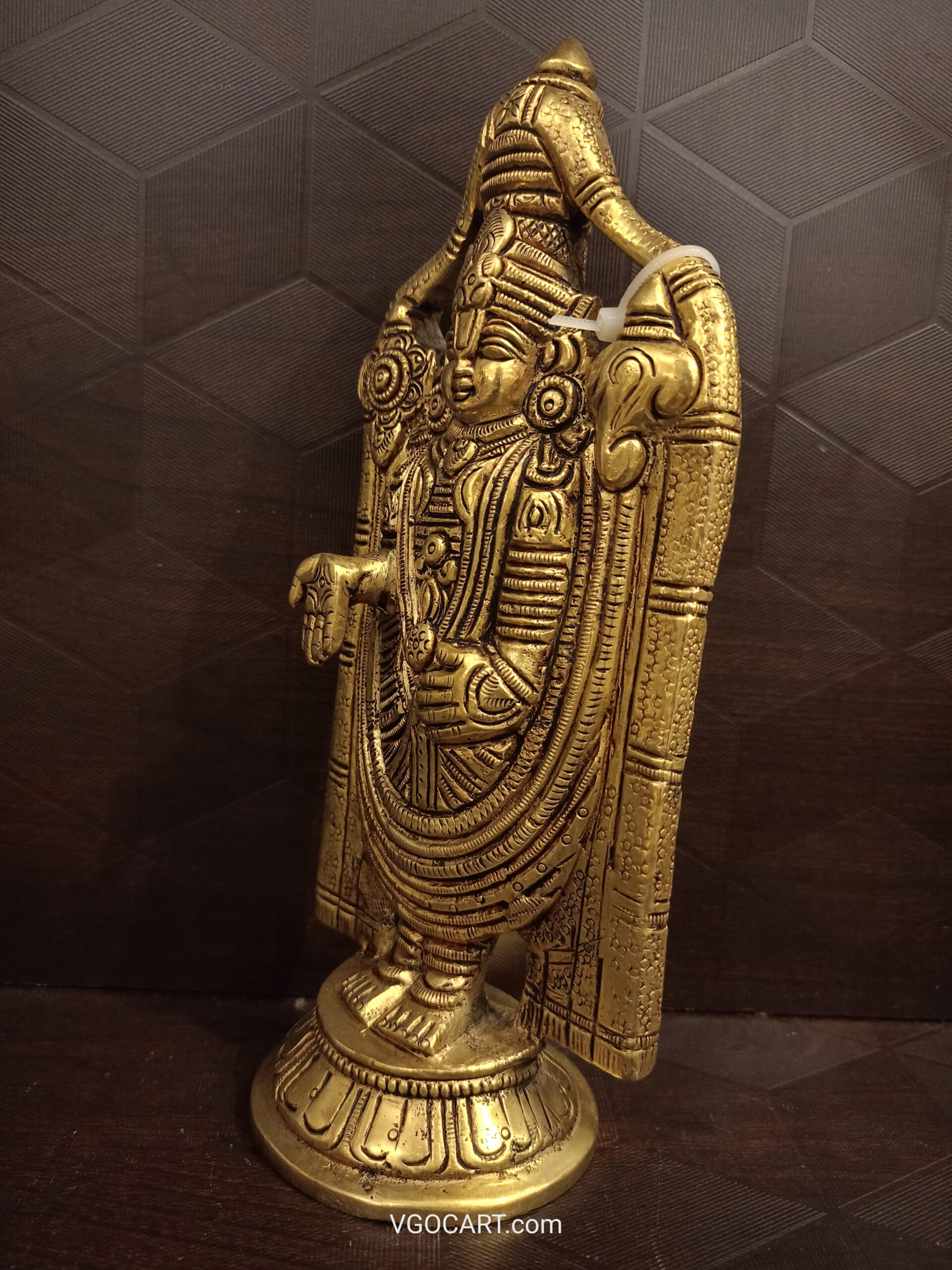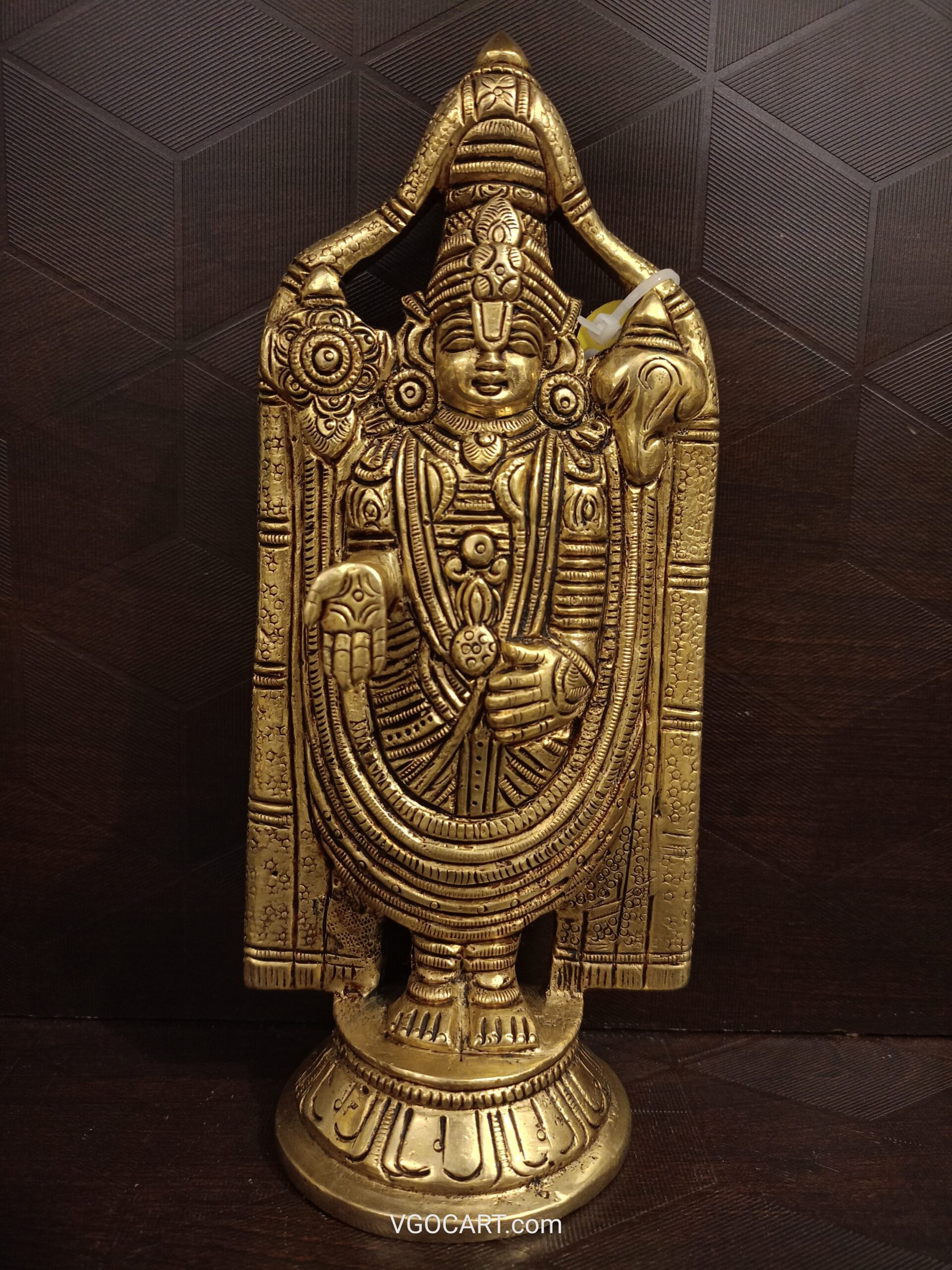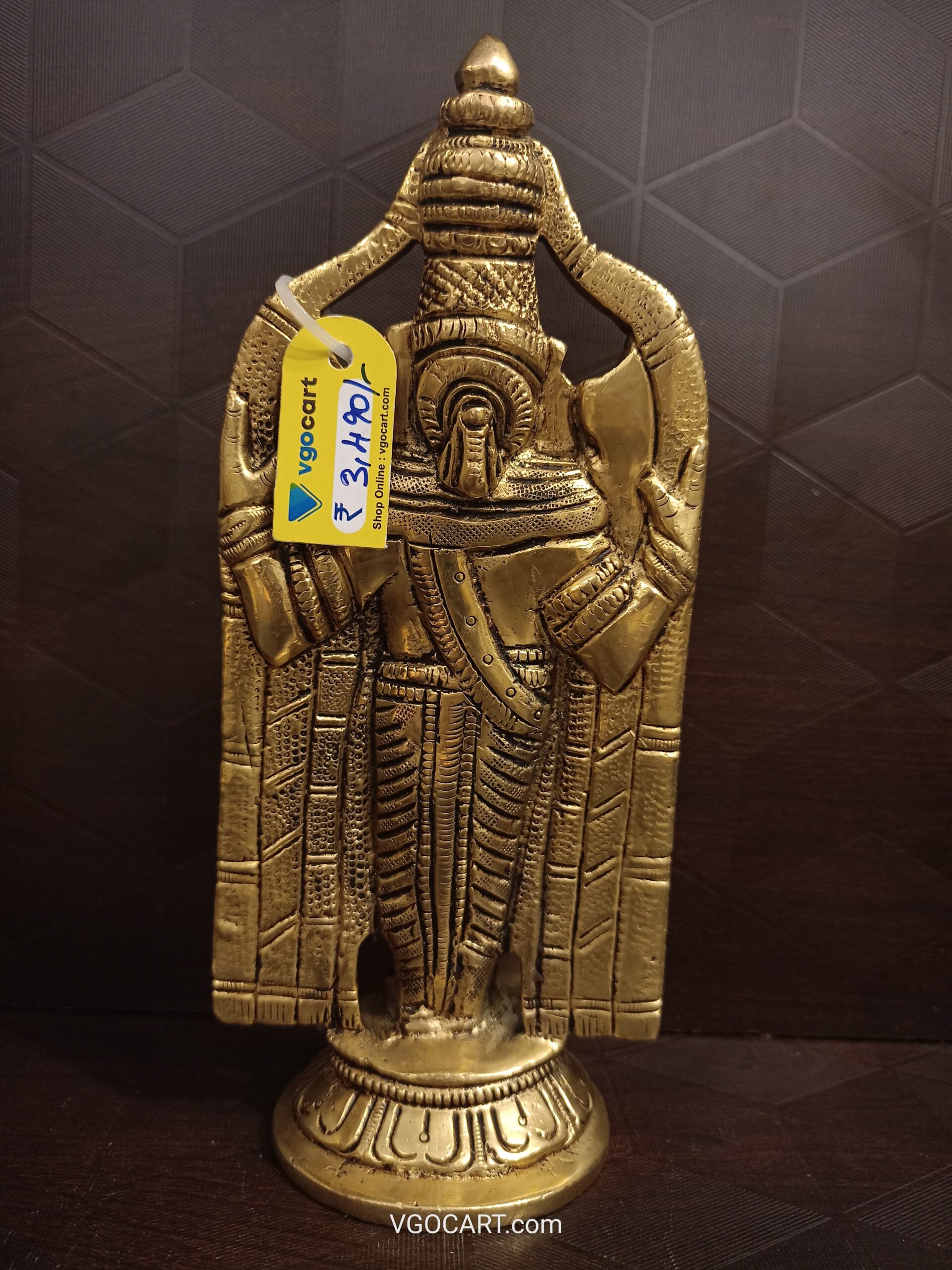 Brass Venkateshwara Idol is designed with detailed carvings and depicted the way where he is standing on a floral designer base and both sides of the Perumal statue are Sangu representing the sound of “om” and chakram representing the changes of the universe.