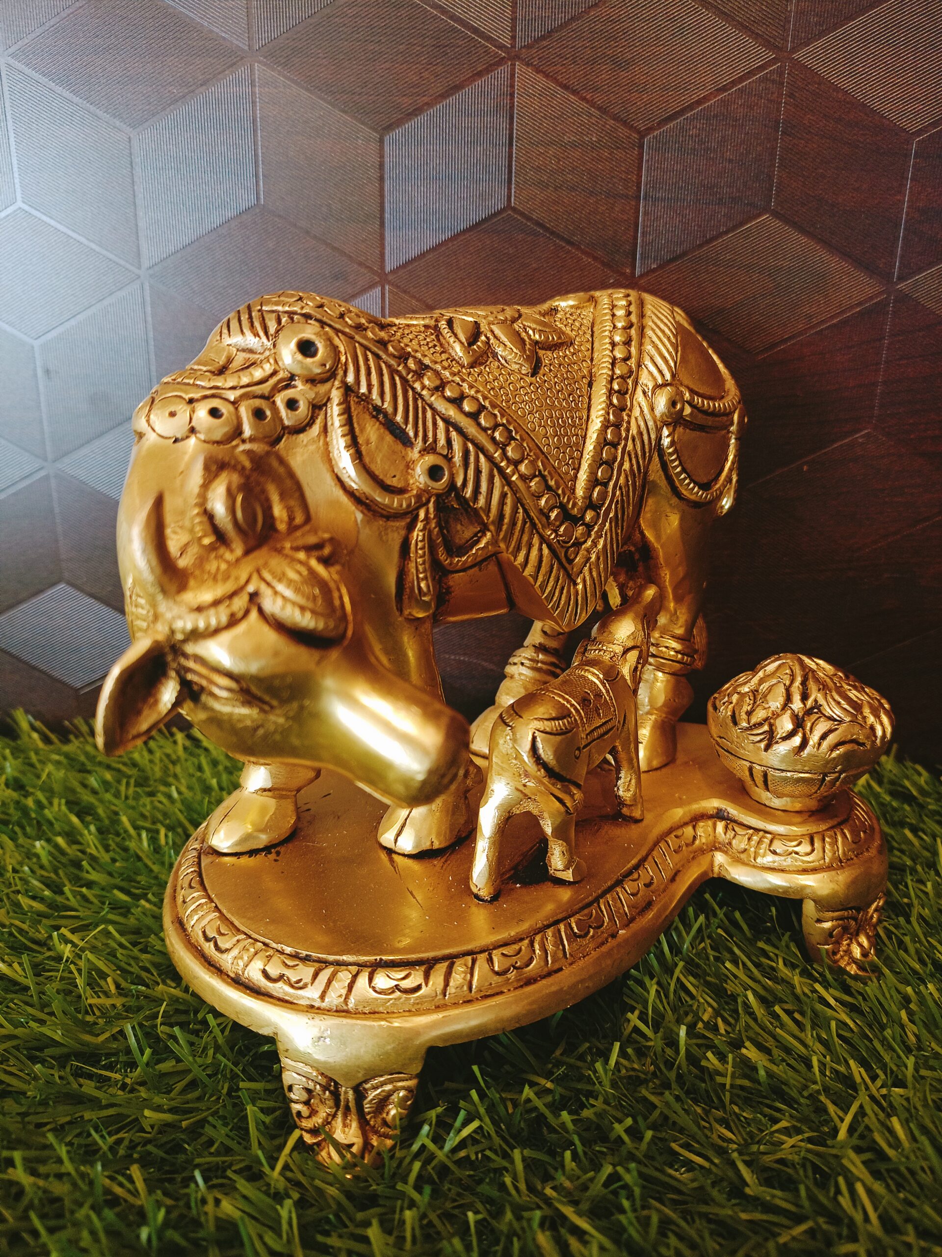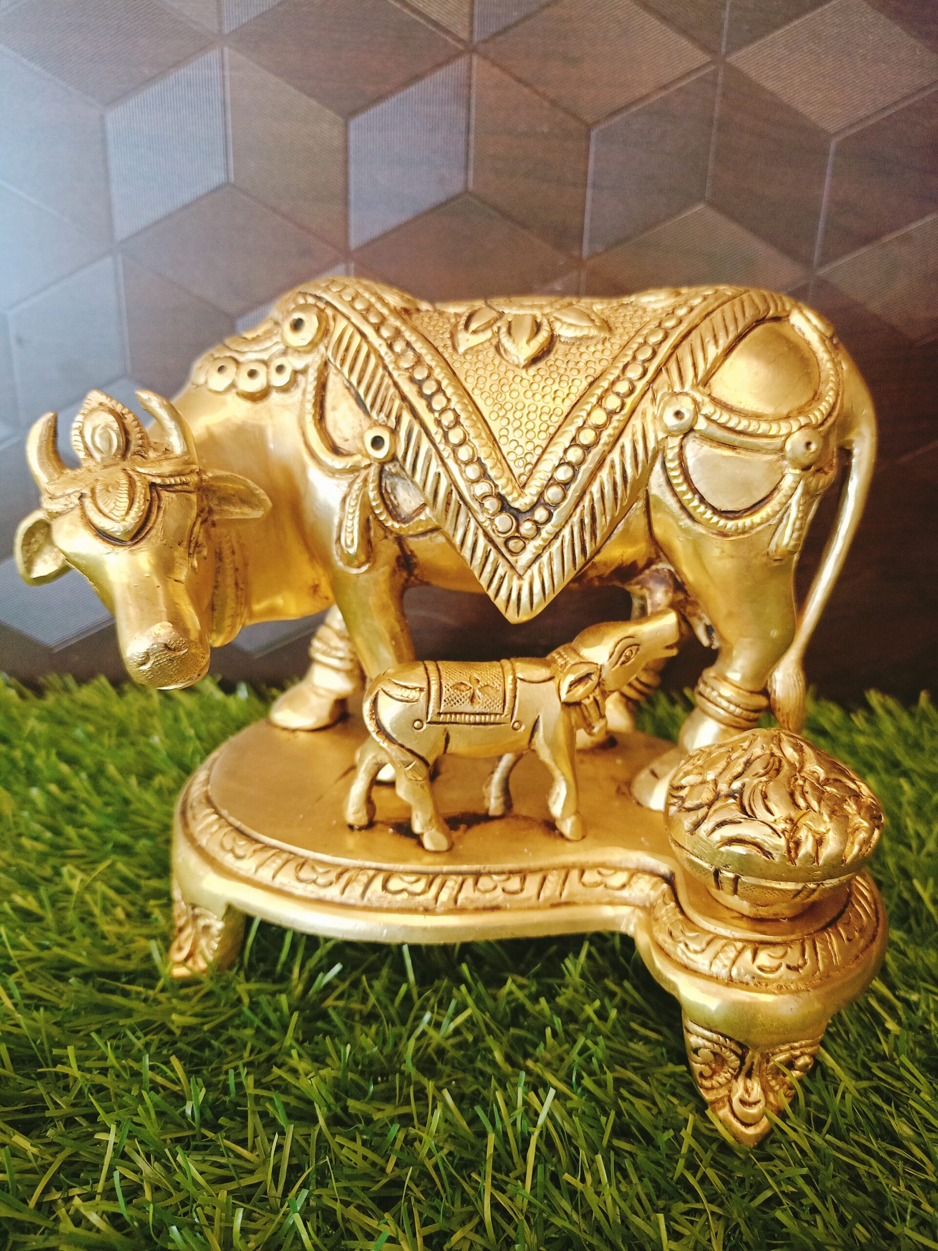 Cow and calf can used in Pooja room by placing in Northeast Direction. Cow and Calf idol Can be gifted to any ocassions like House warming ,Wedding gifts,Return Gifts,etc….
