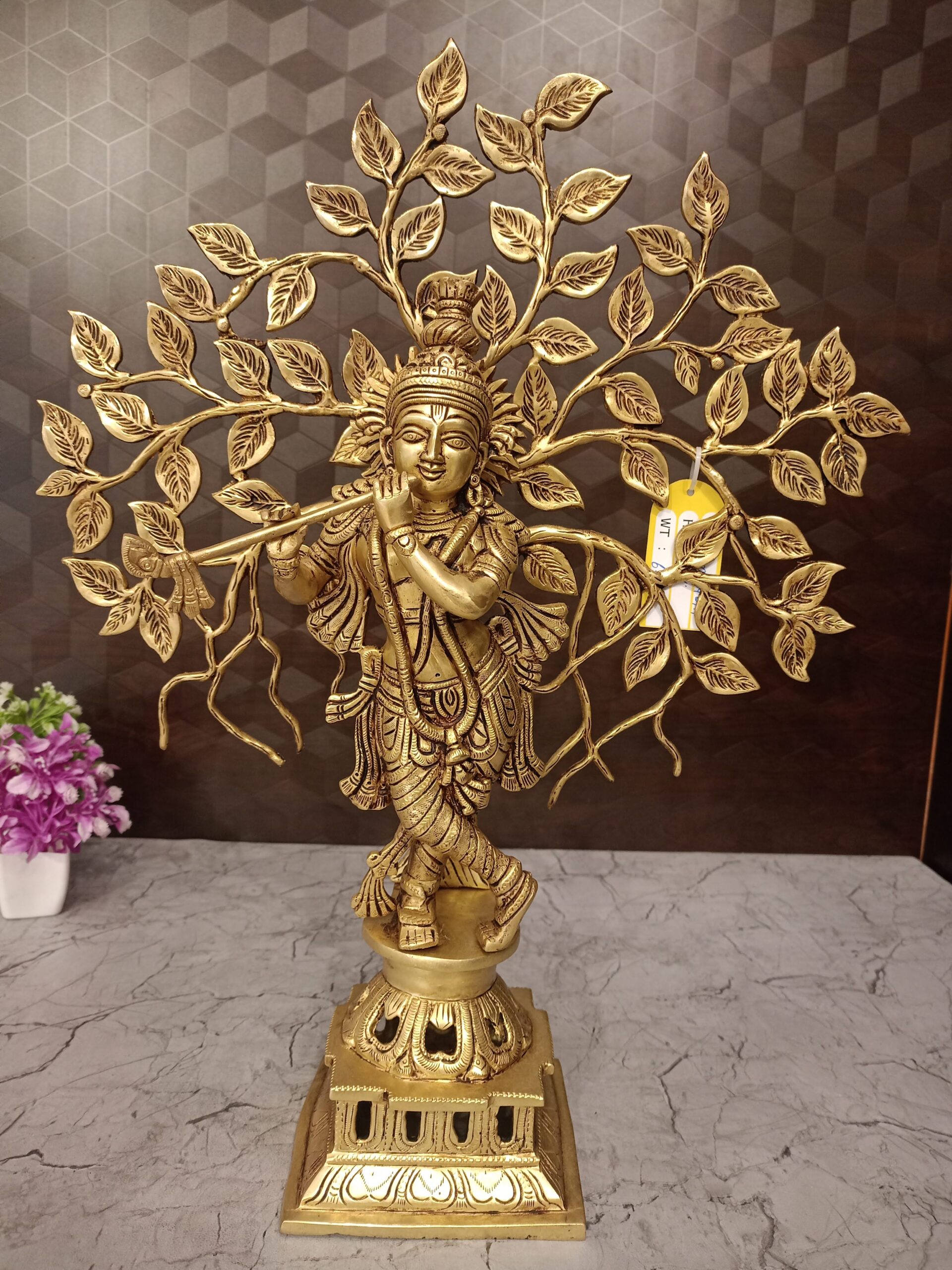 Brass Modern Krishna Under Tree Small Statue for Showpiece is designed with a turban that is attached to a head to the bottom of the idol, he is depicted in a way where he standing under a tree and upside of the floral base. This turban is designed with peacock feathers. He always keeps the flute. Beautiful mesmerizing music always comes to form this flute.