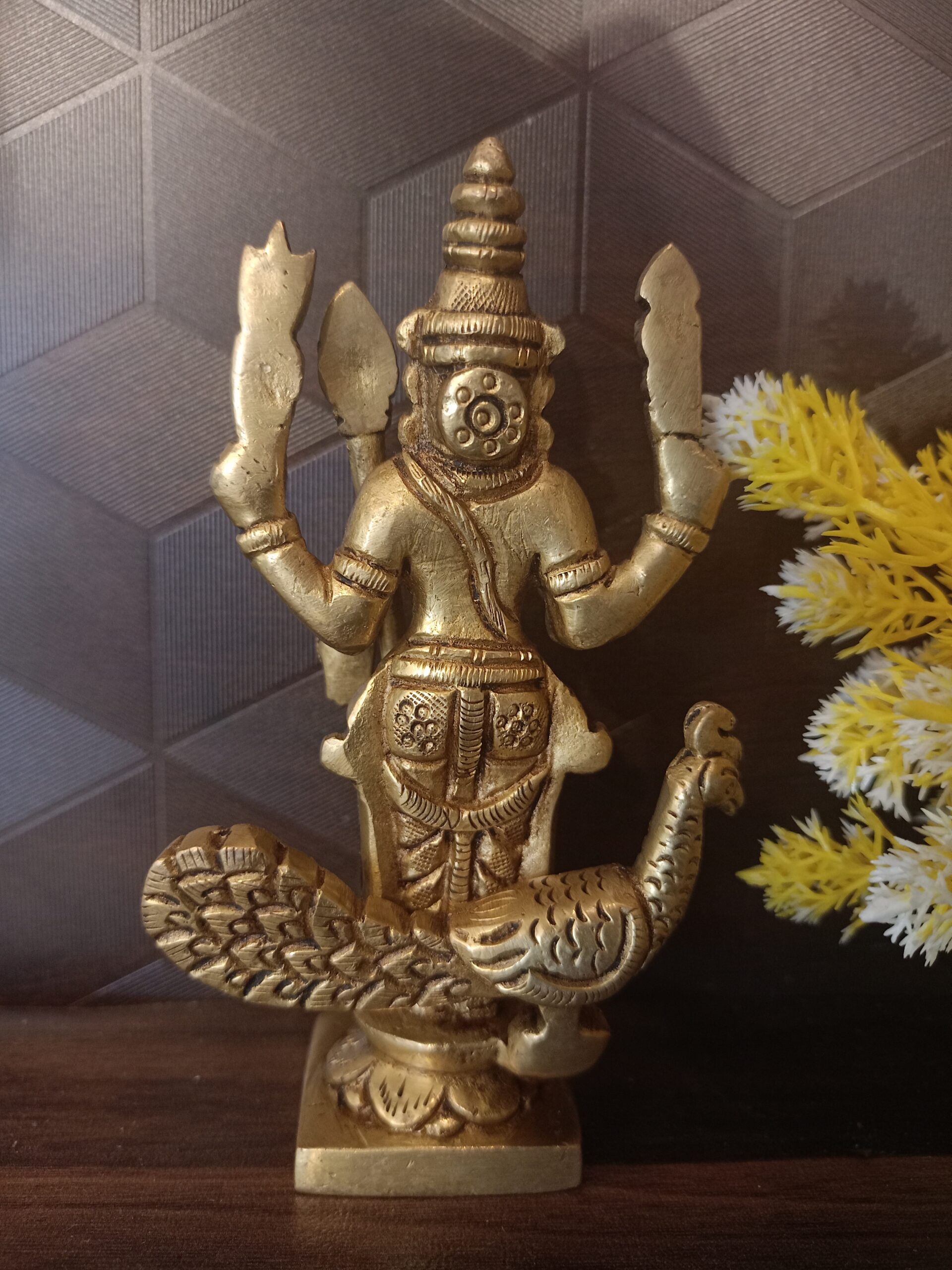 This brass Murugan sculpture depicts Lord Murugan in the form of a royal king. This brass Murugan statue is handcrafted and decorated with beautiful designs and carvings with an artistic base which creates a rich look when kept in the right holy place.