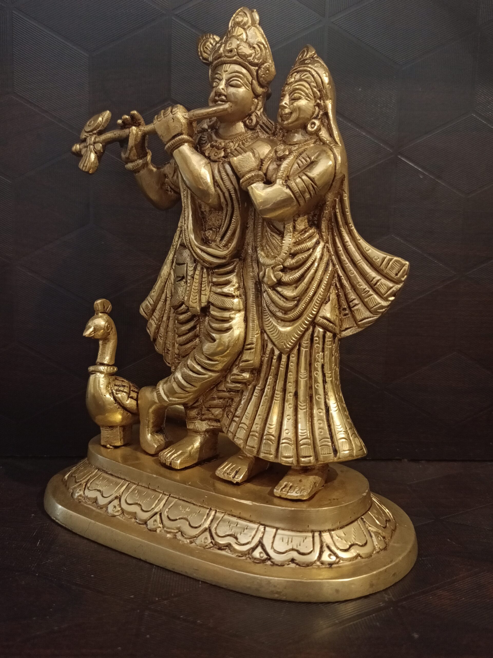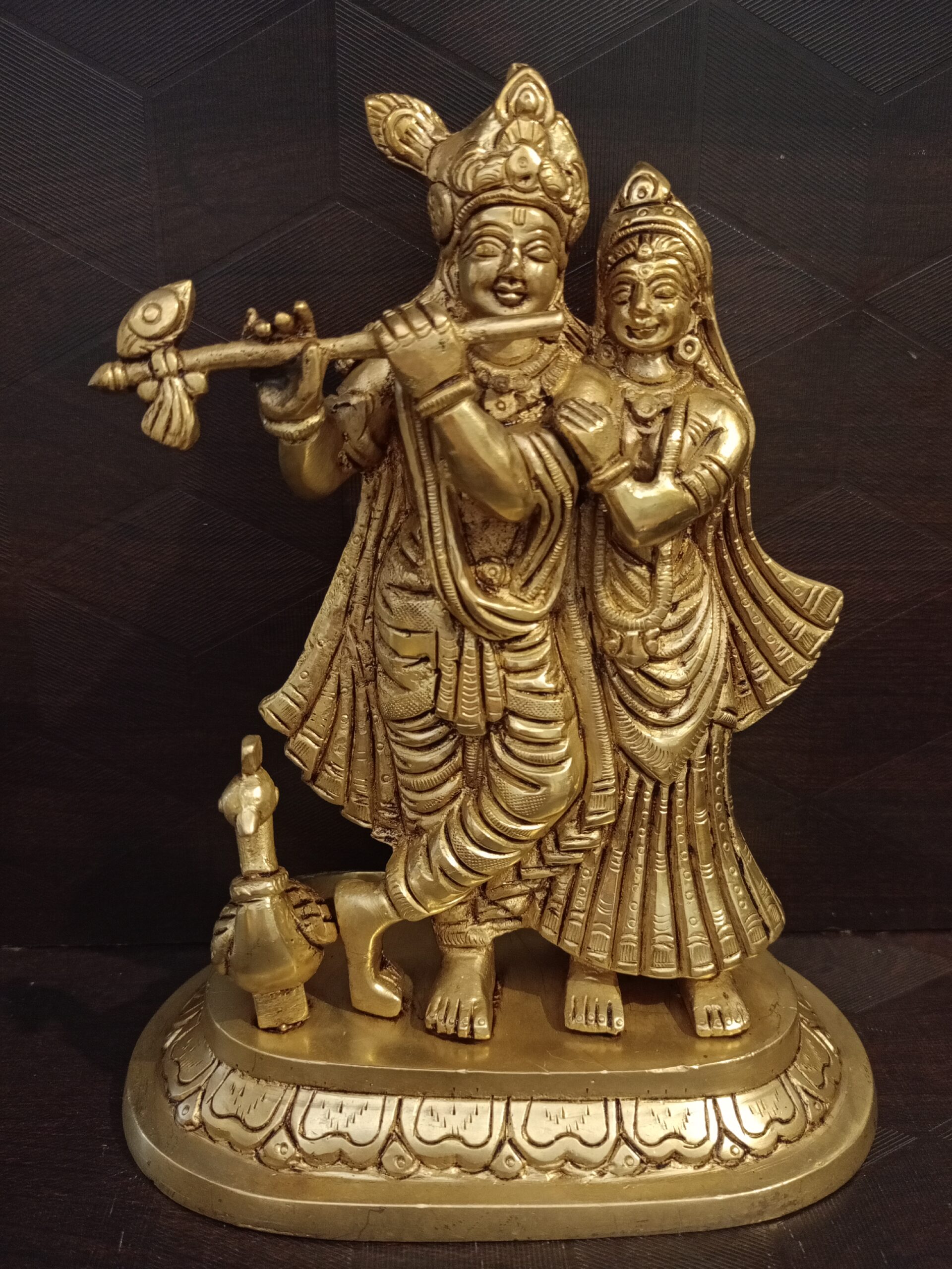Brass Radha Krishna fine art is fine handcrafted brass idol with minute carving works and charming face make the idol unique. Lord Krishna is Considered as avatar of Lord Vishnu and Radha is Considered as avatar of Goddess Lakshmi.it is gifted to your loved one .
