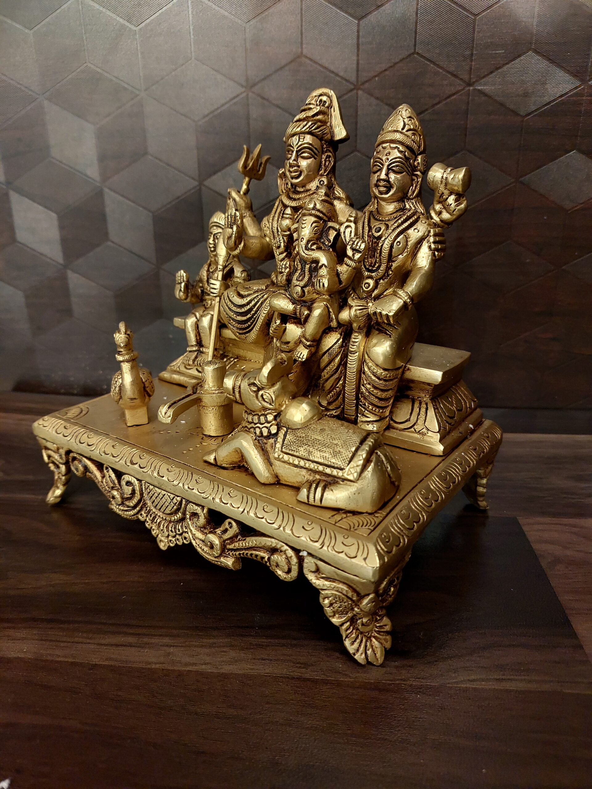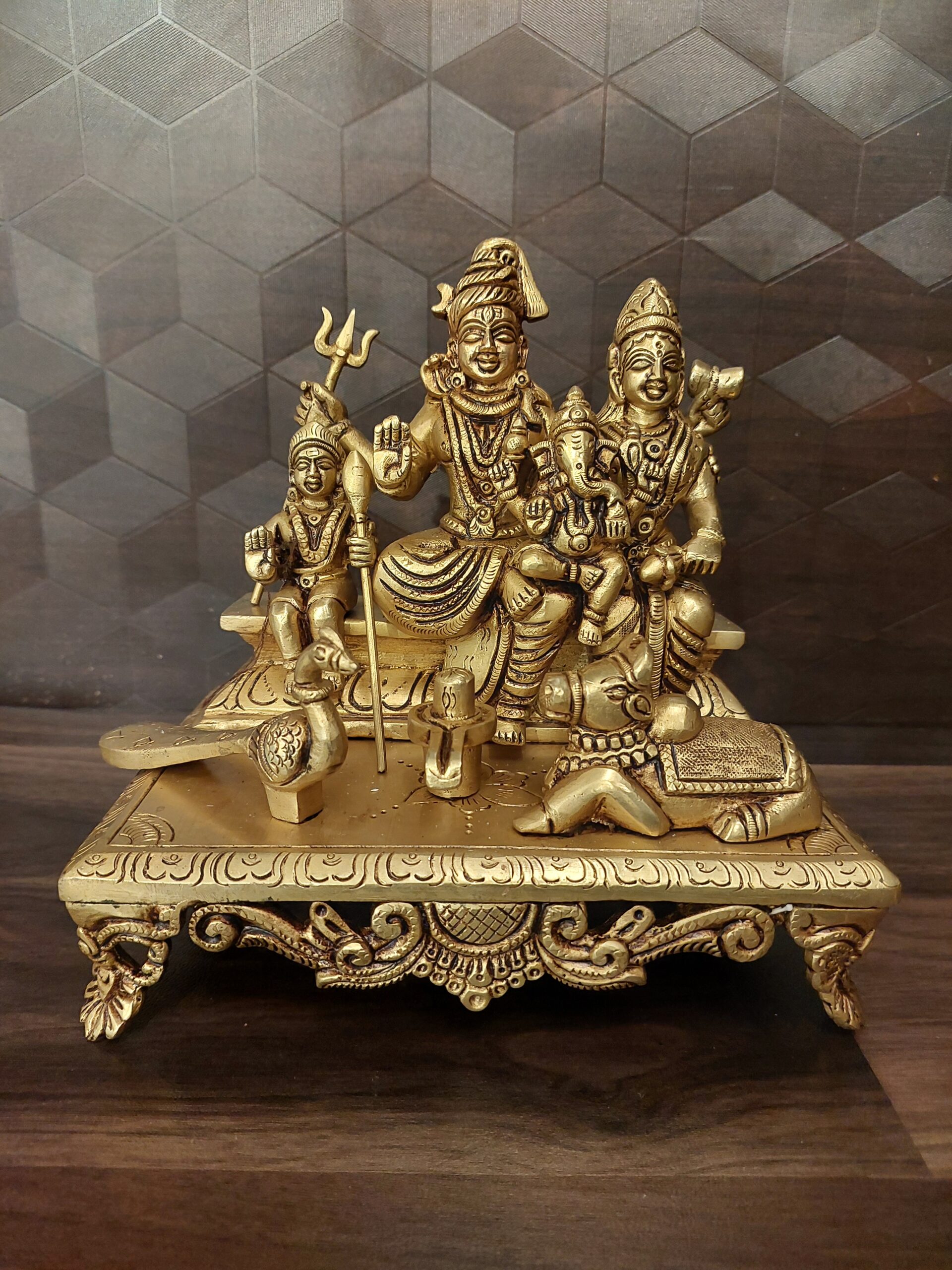Brass Shiva Parvathi idol depicts the whole family placed over a base, including the couple Lord shiva, Devi Parvati, and their sons God Murugan and Ganesha along with their vahana Lion and Bull on either side of the family with a shiva linga in between.