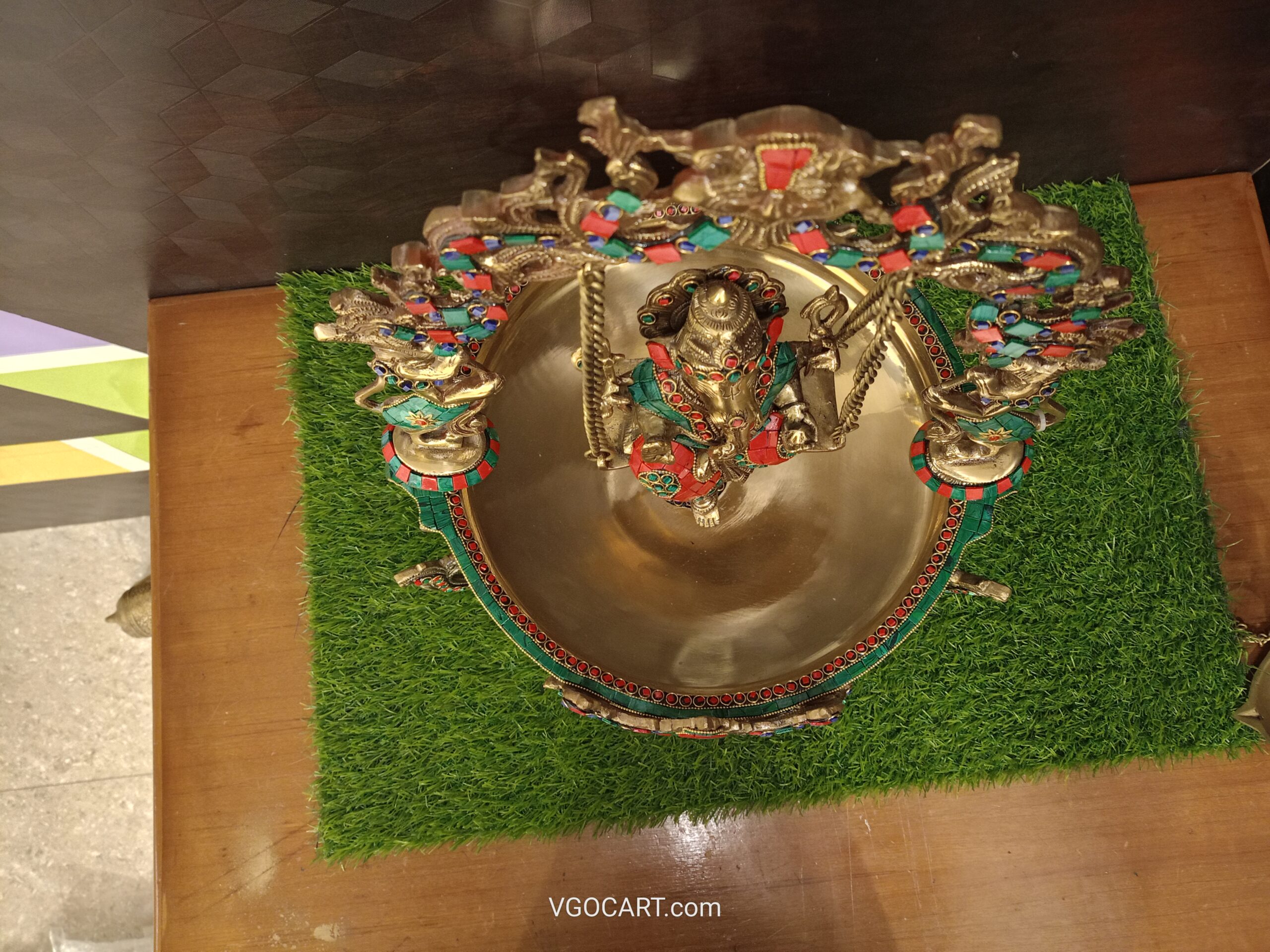 This Brass ganesha Uruli can be displayed empty or filled with water, flowers, diyas and candles . This can decorate the entrance of your home by creating a traditional touch. This brass uruli of ganesha brings both decorative and devotional vibes around the place. This brass ganesha uruli can be a great option for gifting during special occasions.