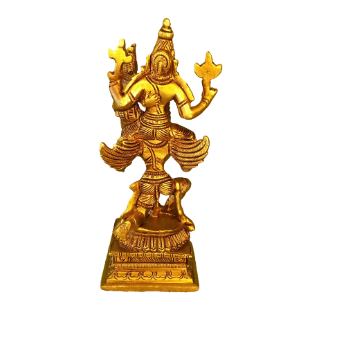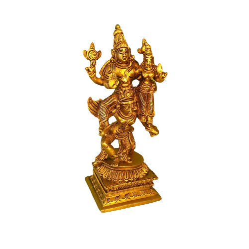 This brass idol has detailed artistic carvings of every iconography of the statue with a beautifully designed base. In this brass sculpture the Vishnu structure is carved like holding Sangu, chakra, and other attributes in his hands, similarly, Goddess Lakshmi holding a lotus bud in her hands. The brass statue’s structure of garuda Bhagavan is portrayed as carrying both Lord Vishnu and his consort Lakshmi on his shoulder.