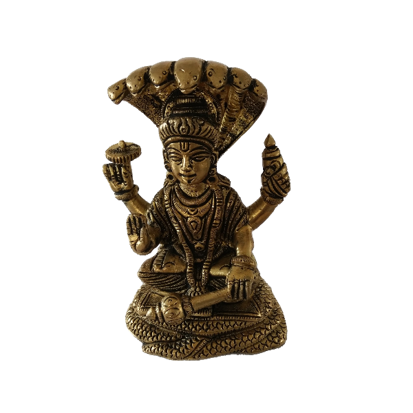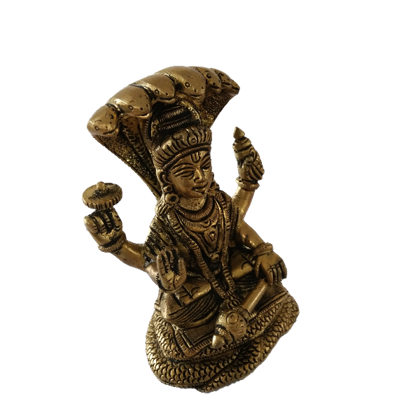 This brass statue of Lord Vishnu is artistically handcrafted with unique and grandly designed specifications that include the exact iconography of Lord Vishnu. This brass Vishnu statue is depicted in the way where Lord Vishnu is seated on Shesha naga with 7 heads and holds Sangu, chakra, and kadhai in his hands along with Abhaya mudra.